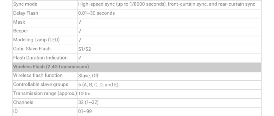 Режим синхронизации: Высокоскоростная синхронизация (до 1/8000 секунд), синхронизация с занавес и синхронизация с занавес