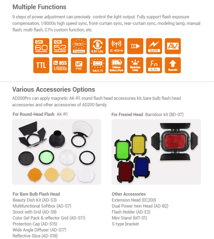 2) большой Ёмкость литий Батарея: Godox AD200 Pro предлагает 500 полный Мощность вспышки с 0,01 до 2,1 сек. Переработки. Расширенный Ручной 9 стоп диапазон регулировки мощности от полного до 1/256 с шагом 1/10 стоп