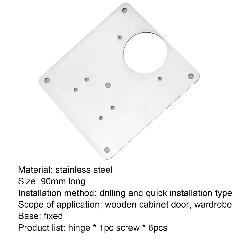 Описание: Эта шарнирная пластина имеет дизайн с несколькими отверстиями, чтобы предотвратить разлом двери по-разному, что может легко удовлетворить различные потребности. Изысканная и профессиональная работа делает эту шарнирную пластину не легко ржаветь. Утолщенная стальная пластина затрудняет деформу и очень сильна. Изготовлен из нержавеющей стали, очень прочный в использовании. Длина этого изделия составляет 9 см. Подходит для деревянные дверцы для шкафа, шкафа, мебели и так далее. И его основание зафиксировано. Наименование товара: дверная петля для шкафа Материал: нержавеющая сталь Способ установки: перфорированный Тип быстрой установки Рабочая среда: деревянные дверцы для шкафа, шкафы Характеристики: прочная, прочная, нержавеющая Толщина изделия: около 1 мм Информация о размере: Длина: 9 см/3,5 "(прибл.) Толщина: 0,1 см/0,04 (прибл.) Примечания: Благодаря светильник и экрана Цвет Товара может быть s светильник ly отличается из-за характеристик монитора компьютера. Возможны незначительные отклонения в размерах из-за различных измерений вручную. Посылка включает в себя: 1 x шарнирная пластина 6 винтов