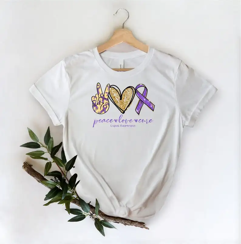 Волчанки осведомленности Peace Love вылечить Футболка 100% хлопок футболка с круглым вырезом, футболка с короткими рукавами и милым модный топ, футболки для женщин, женские туфли в готическом стиле
