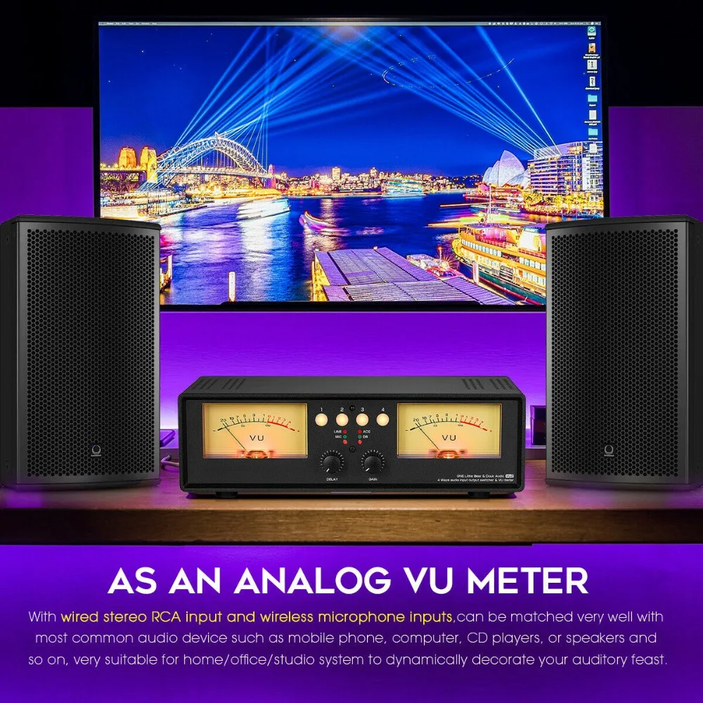 Как аналоговый VU метр, с проводным стерео входом RCA и беспроводными входами микрофона, может быть хорошо сочетается с наиболее распространенными аудиоустройствами, такими как мобильный телефон, компьютер, CD плееры, или колонки и так далее, очень подходит для дома/офиса/студии, чтобы динамично украсить ваш слуховой праздник.