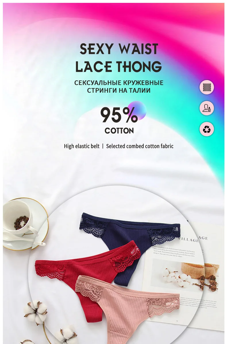 Трусики-стринги женские, однотонные, с кружевной каймой, 1 шт.компл.