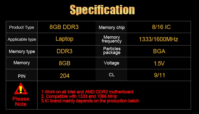 Описание продукцииМодель ноутбука: DDR3 2 ГБ/4 ГБ/8 ГБЕмкость: 2 ГБ/4 ГБ 8 ГБСкорость памяти: 1066 МГц 1333 МГц 1600 МГцРазъем памяти: SO-DIMMБренд чипсета: HY,SEC,MIC,ELP ....Задержка CAS: 1333 МГц = CL9 1600 МГц = CL11Время памяти: 1333 МГц = 9-9-9-24 1600 МГц = 11-11-11-28Булавки: 204pinНапряжение: DDR3 = 1,5 VОсобенности: без буфераФункция: без ECCРазмер печатной платы, цвет и Марка чипа памяти зависят от заводской партии продукции, не всегда то же самое!Чип памяти бренда может быть Skhynix,Samsung.Elpida,Micron,Nanya и так далееИзображение дисплея продукта только для справкиВы должны подтвердить, поддерживает ли ваш ноутбук низковольтные версии памяти.Если вы не можете подтвердить, пожалуйста, свяжитесь с нами для получения помощи