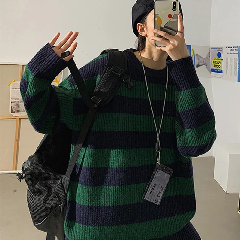 Осенне-зимний вязаный полосатый свитер для женщин, повседневный Большой пуловер, теплые свободные свитера, джемпер, уличная одежда для подростков