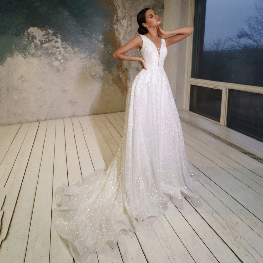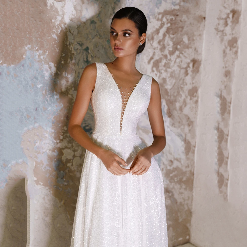 Женское свадебное платье с блестками, с V-образным вырезом и открытой спиной