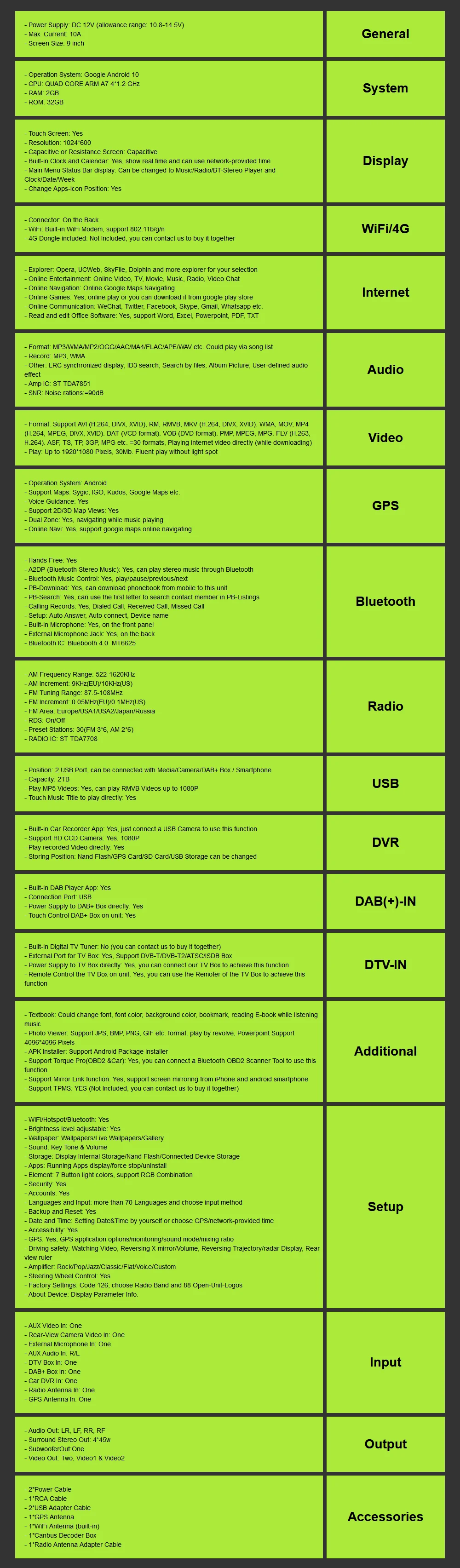 Стерео поставляется с аксессуарами, как показано на изображении аксессуаров, если вам нужен другой провод или аксессуары для установки, вам нужно купить отдельно.Если мы отправим товар из Китая через DHL, если при прибытии на вашу национальную таможню взимаются таможенные пошлины, покупатели должны оплатить его. Если у вас есть специальный запрос, пожалуйста, свяжитесь с нами при оформлении заказа.Важное примечание:Пожалуйста, проверьте свой оригинальный размер и внешний вид автомобиля, прежде чем сделать заказ, чтобы избежать ошибки.