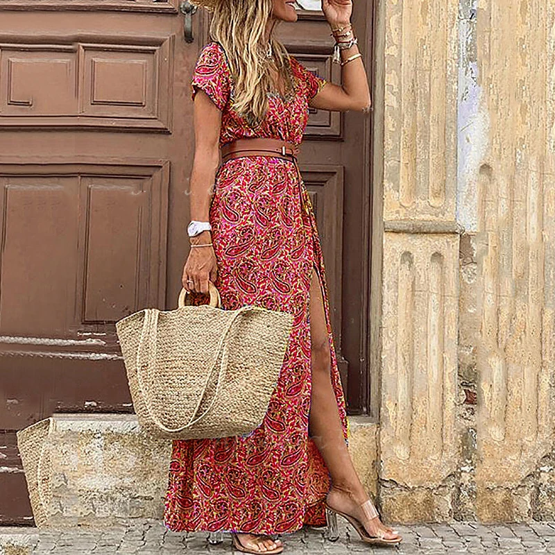 Женское шифоновое платье в стиле бохо, летнее экзотическое длинное платье с коротким рукавом, повседневное элегантное платье с цветочным принтом, сексуальное вечернее платье с V-образным вырезом, 2021