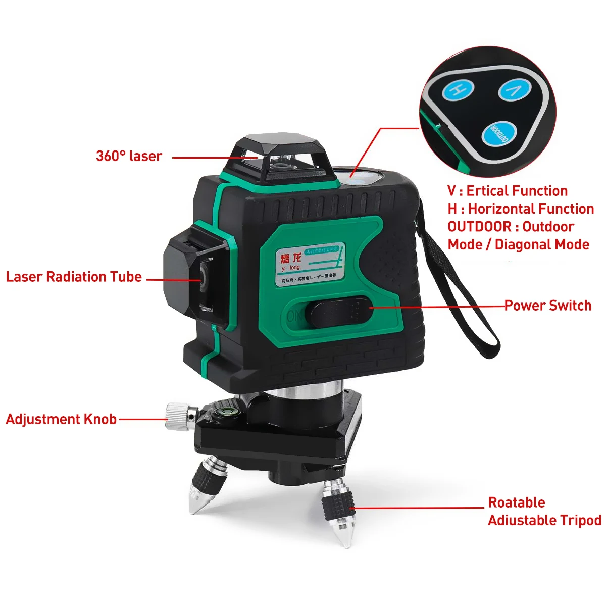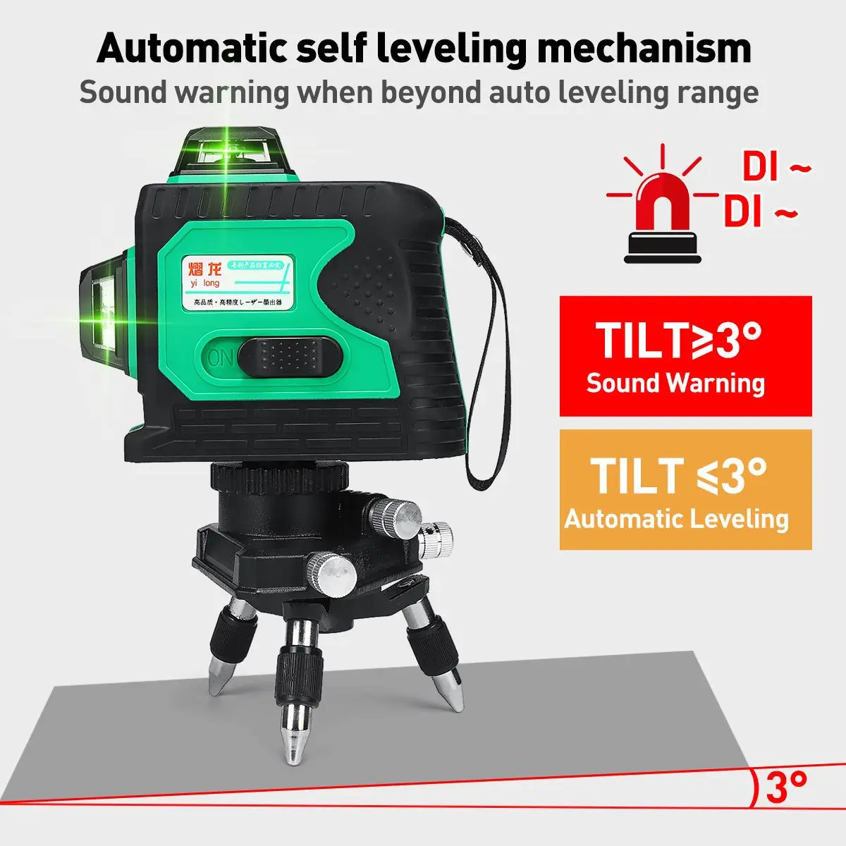 Особенности:-Этот профессиональный самонивелирующийся лазерный уровень имеет 12 линий для выравнивания и точного измерения.-Автоматический самонивелирующийся механизм. Звуковое предупреждение при превышении диапазона автоматического выравнивания.-Вращающееся на 360 ° основание с тонкой ручкой настройки, быстро идентифицирует цель.-Кнопка водостойкая, износостойкая и изысканная, проста в эксплуатации.-Утолщенное металлическое основание обеспечивает стабильную поддержку и ударопрочность, ударопрочность.-Точечная функция, точное позиционирование машины.-Легко носить с собой пластиковый чехол и ремень для переноски, обеспечивая быструю и удобную мобильность и хранение.-Широкое применение для вспомогательной фиксации плитки, украшения стен, фиксации напольной плитки, лестничных поручней и многого другого.