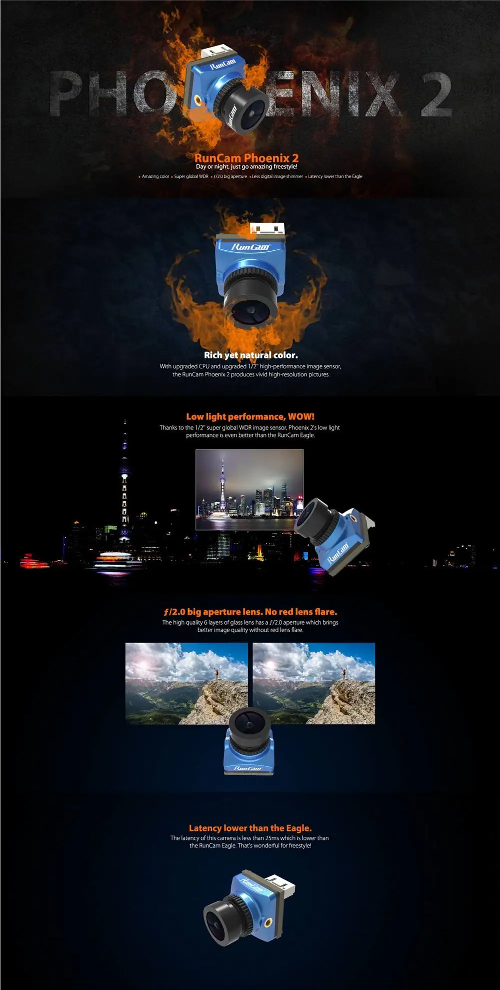 Особенности:-Богатый, но естественный цвет. С улучшенным CPU и модернизированным 1/2''Высокопроизводительный датчик изображения, RunCam Phoenix2 производит яркиеИзображения с высоким разрешением.-ОтличноНизкий светильник. Спасибо за то, что 1/2 ''превышает Глобальный WDR образДатчик, низкий светильник phoenix2 даже лучше, чем RunCamОрел.-? /2,0 Большая диафрагма объектива. МеньшеКрасная вспышка объектива. Высокое качество 6 слоев стеклянных линз есть? /2,0Диафрагма, которая приносит меньше красных бликов и меньше фиолетовых окантовокЭффект.-Меньше цифрового мерцания. По сравнению с RunCam Eagle, RunCam Phoenix2 имеет гораздо меньшее цифровое мерцание и более чистое изображение.-Низкая задержка. Эта камера находится на том же уровне задержки RunCam Eagle, и это замечательно для фристайла полета!Руководство на английском языке, нажмите здесьПосылка включает в себя:1 камера RunCam Phoenix21x ABS кронштейн1x 6pin FPV силиконовый кабель1 комплект винтов1x Руководство пользователя