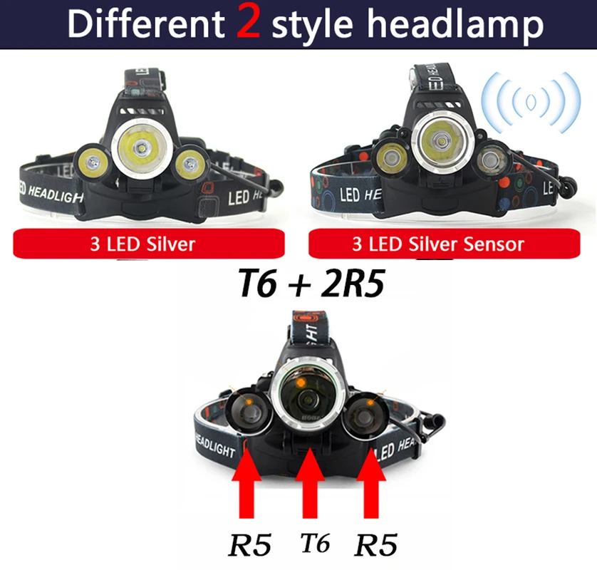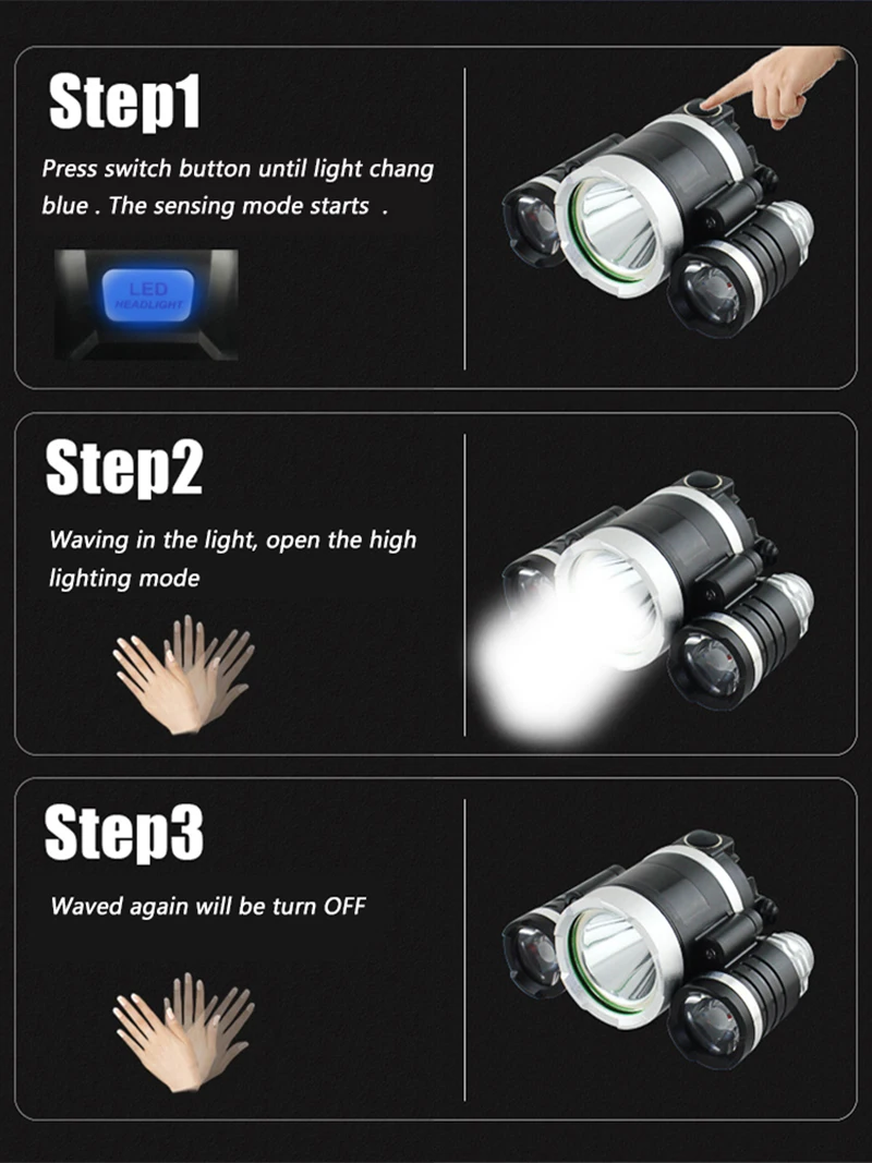Мощный Головной фонарь с 3 светодиодами и датчиком, водонепроницаемый Головной фонарь T6 с фиксированным фокусом и аккумулятором 18650