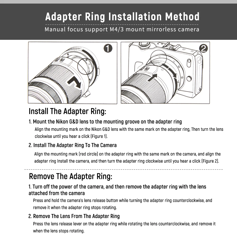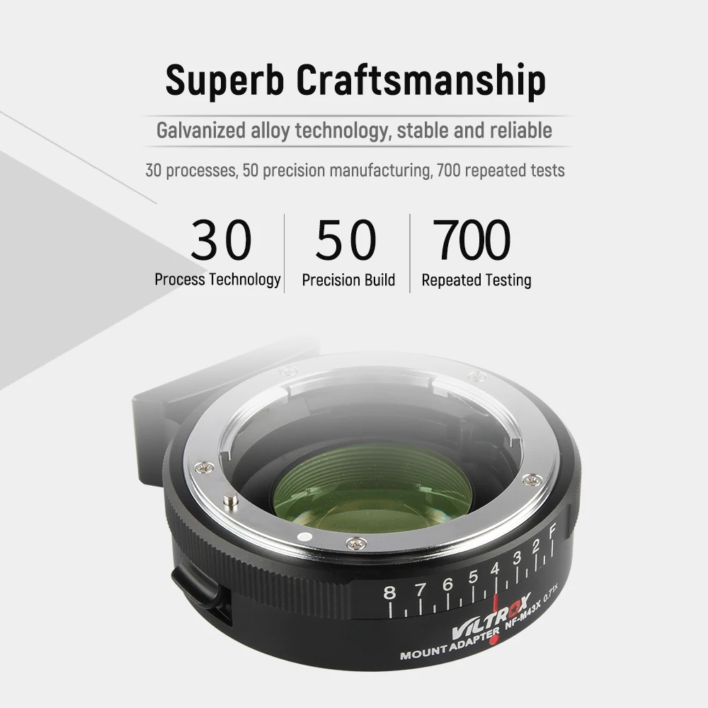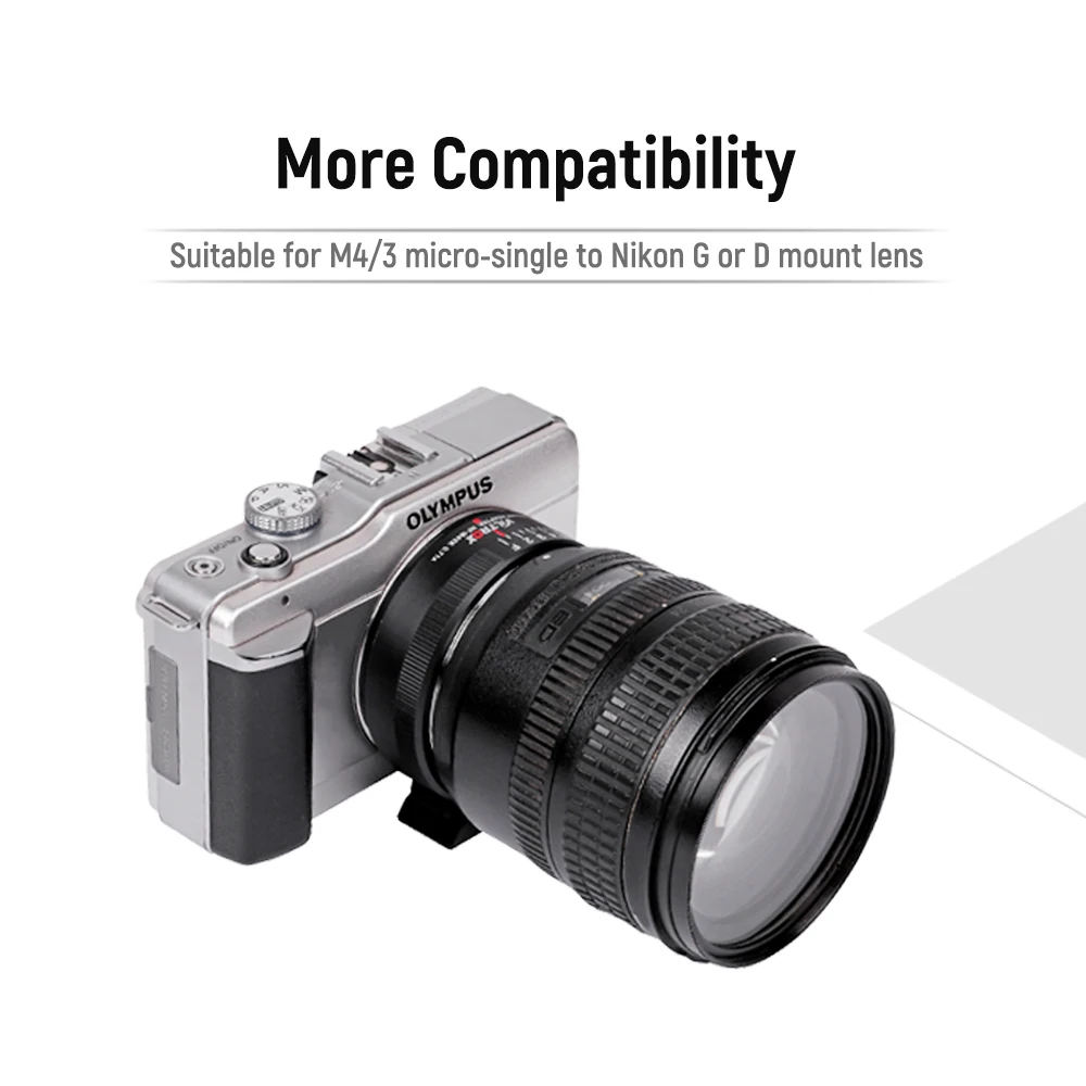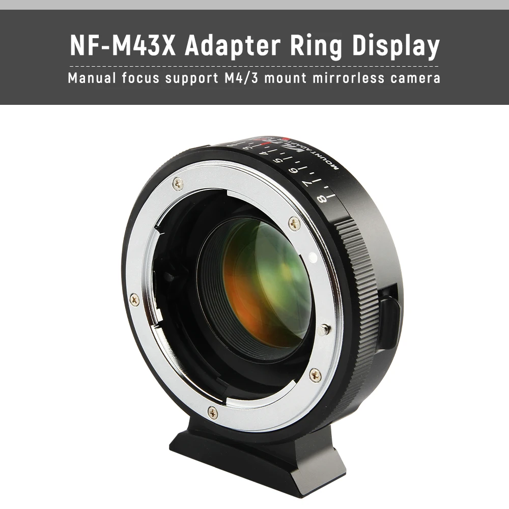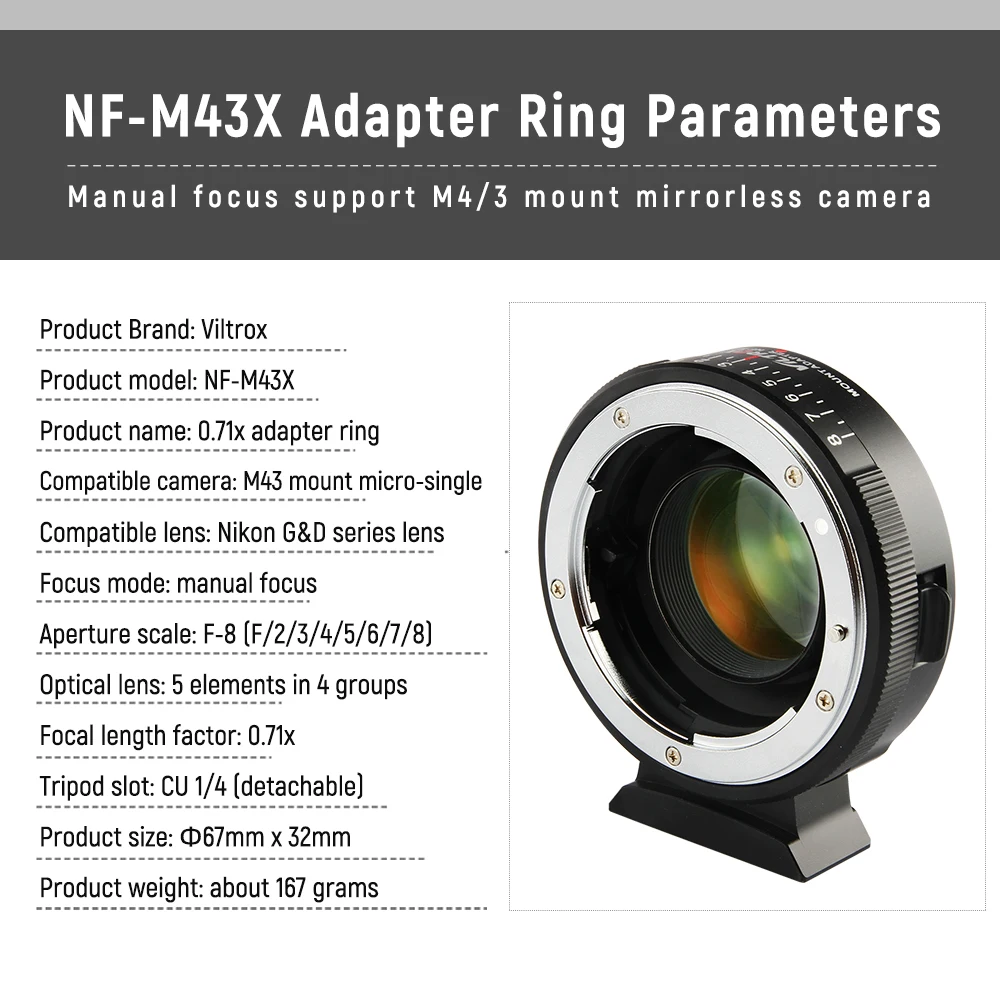 Адаптер объектива Viltrox NF-M43X позволяет использовать объектив Nikon G & D для беззеркальной камеры M4/3. Фокусное расстояние составляет 0,71x на основе исходного фокусного расстояния (эквивалентное фокусное расстояние = фокусное расстояние x0,71), что помогает увеличить диафрагму 1-stop. Он предназначен для 4 групп 5 встроенных оптических очков с регулируемой апертурой вручную (F-8 шкалой регулировки).