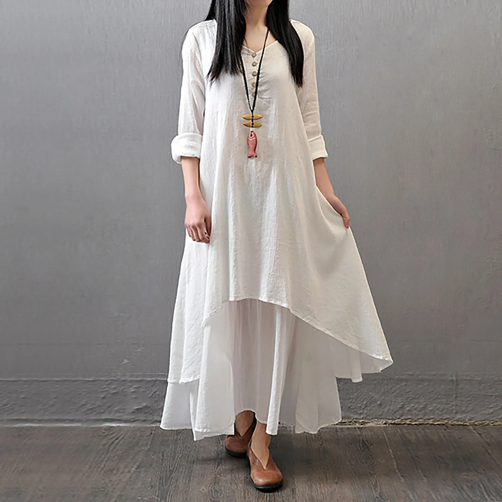 Женские Летние льняные двухслойные Асимметричные Макси-платья с круглым вырезом и пуговицами