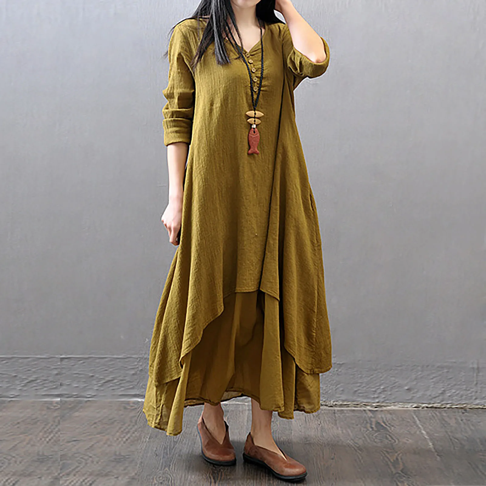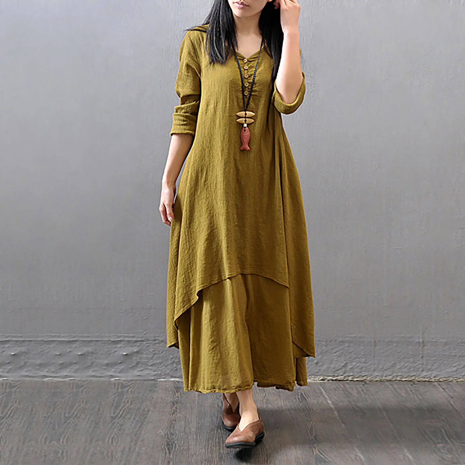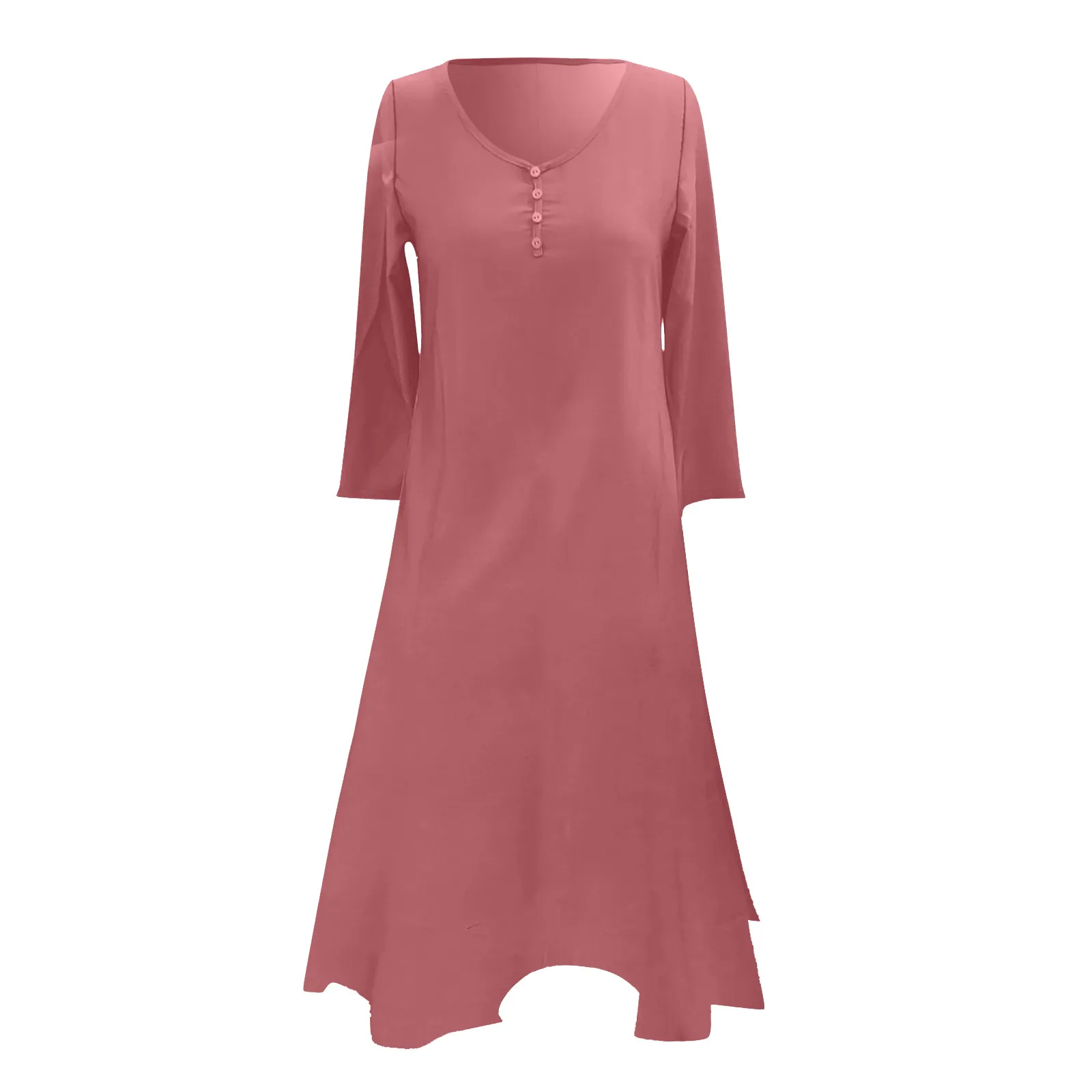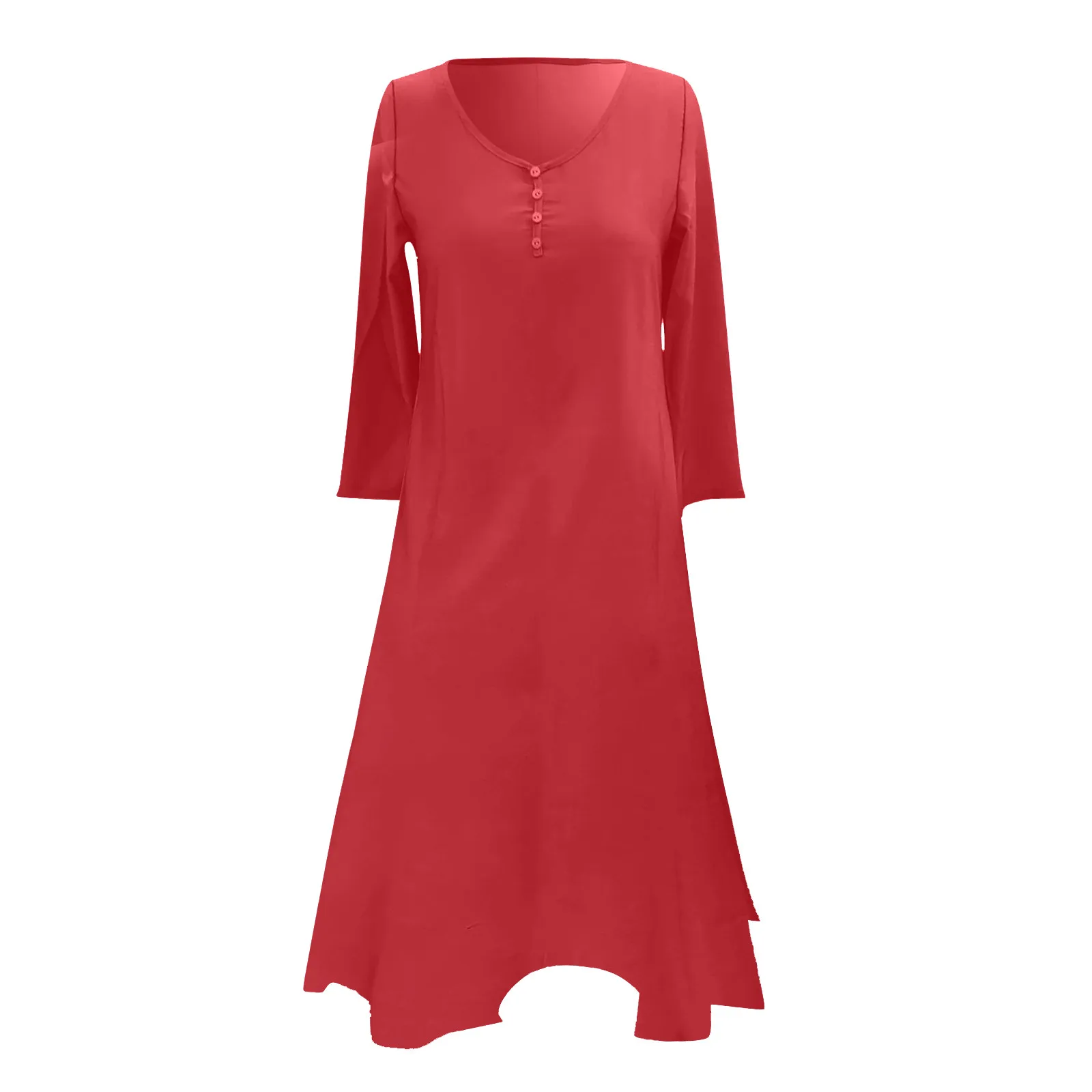 Летнее повседневное платье, женское однотонное льняное платье, модные свободные двухслойные Асимметричные Макси-Платья на пуговицах с круглым вырезом #4