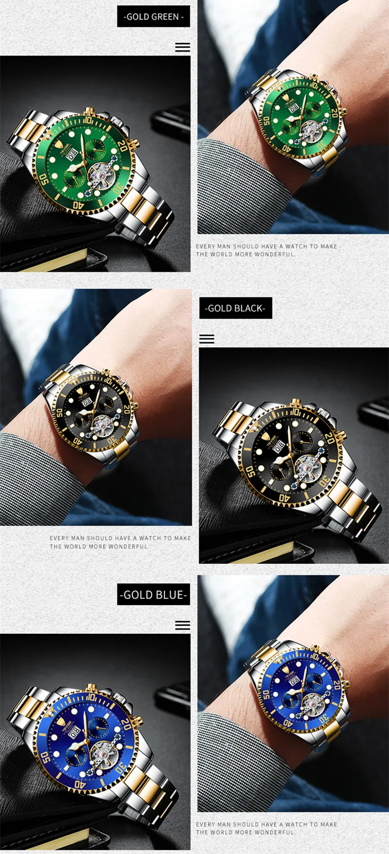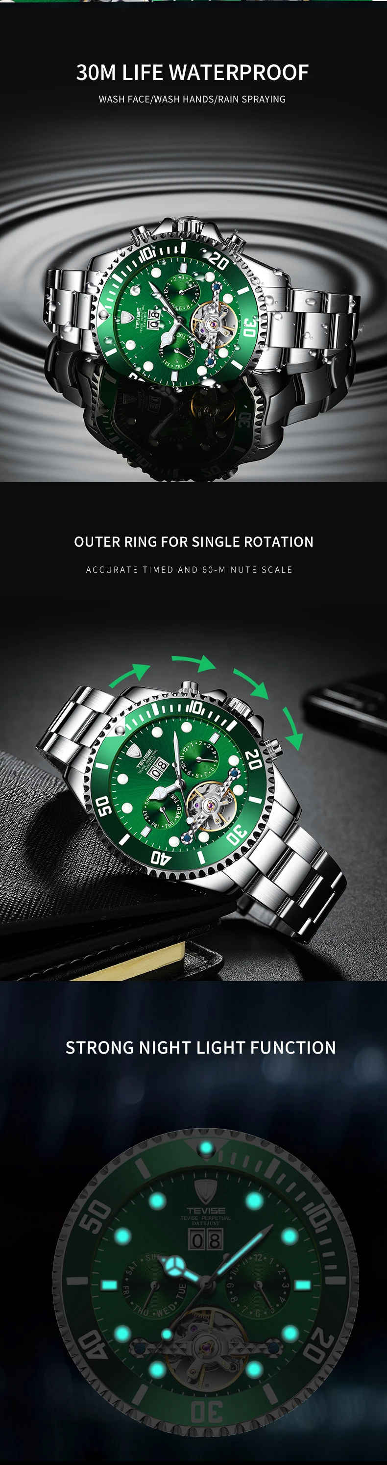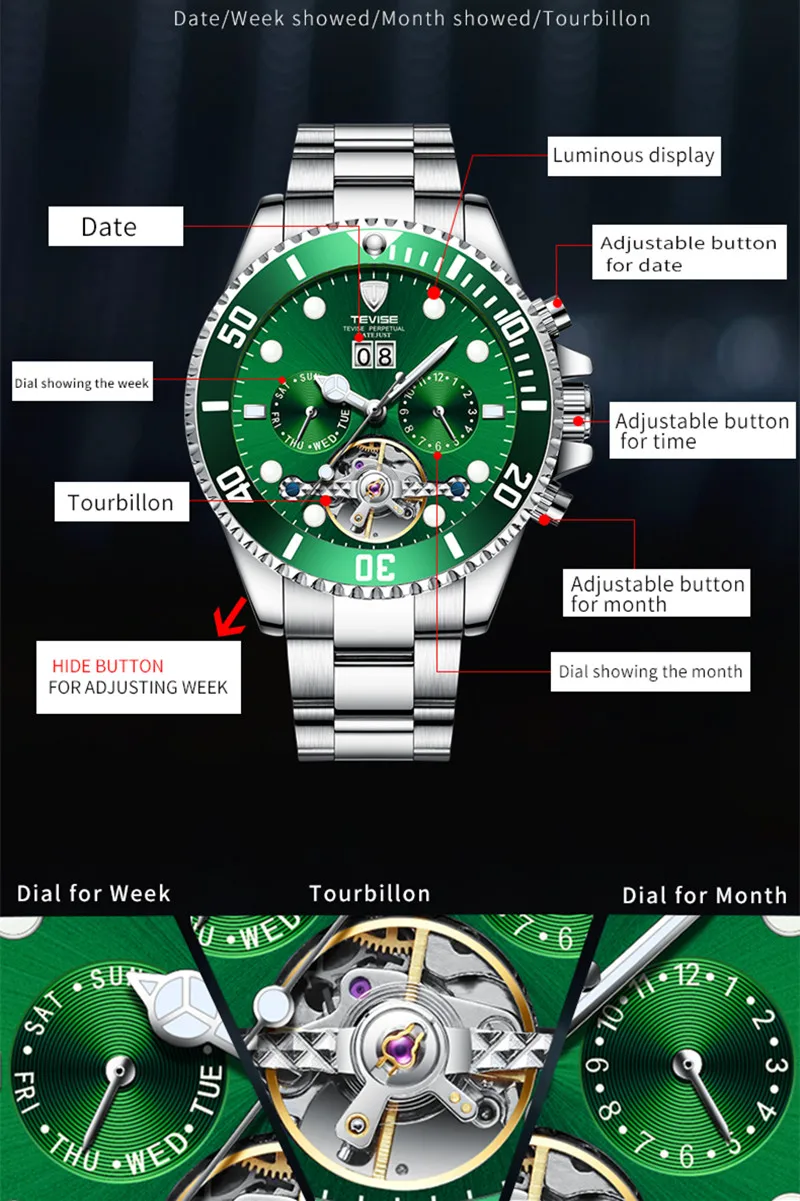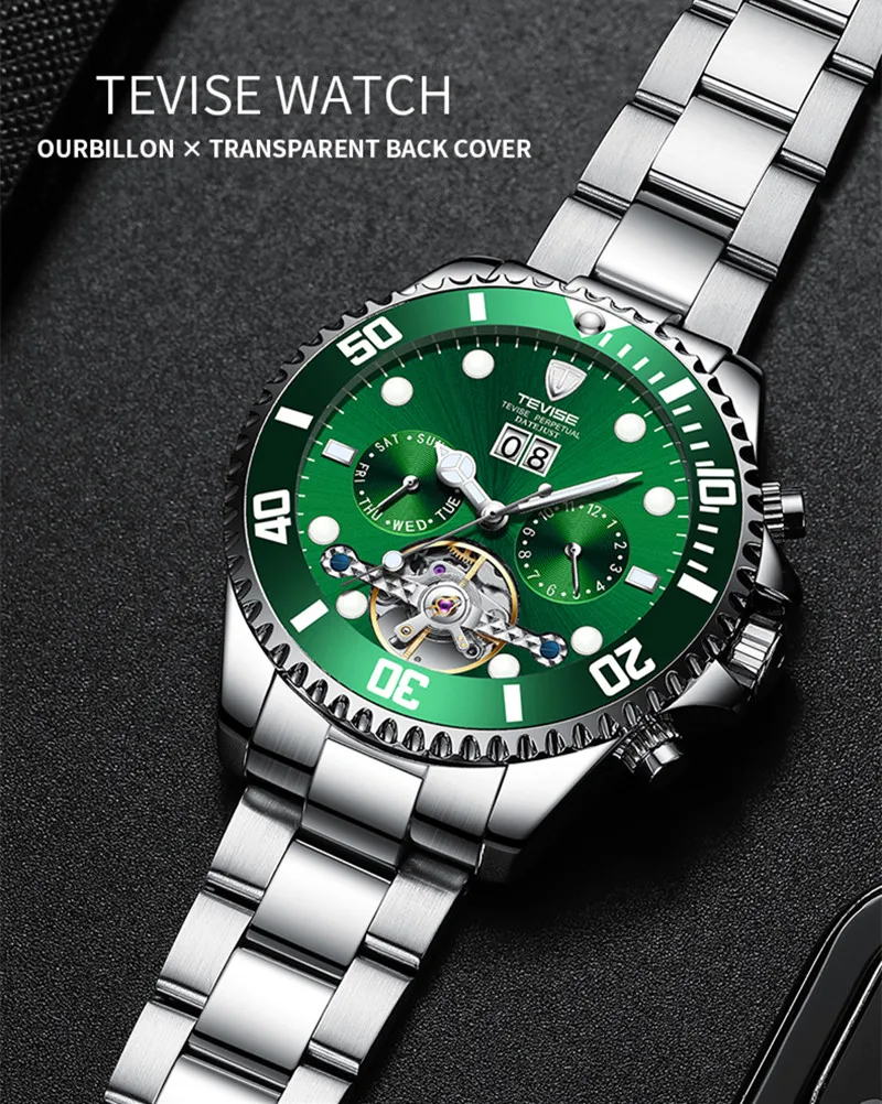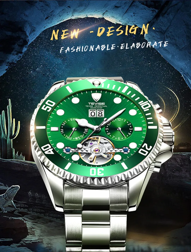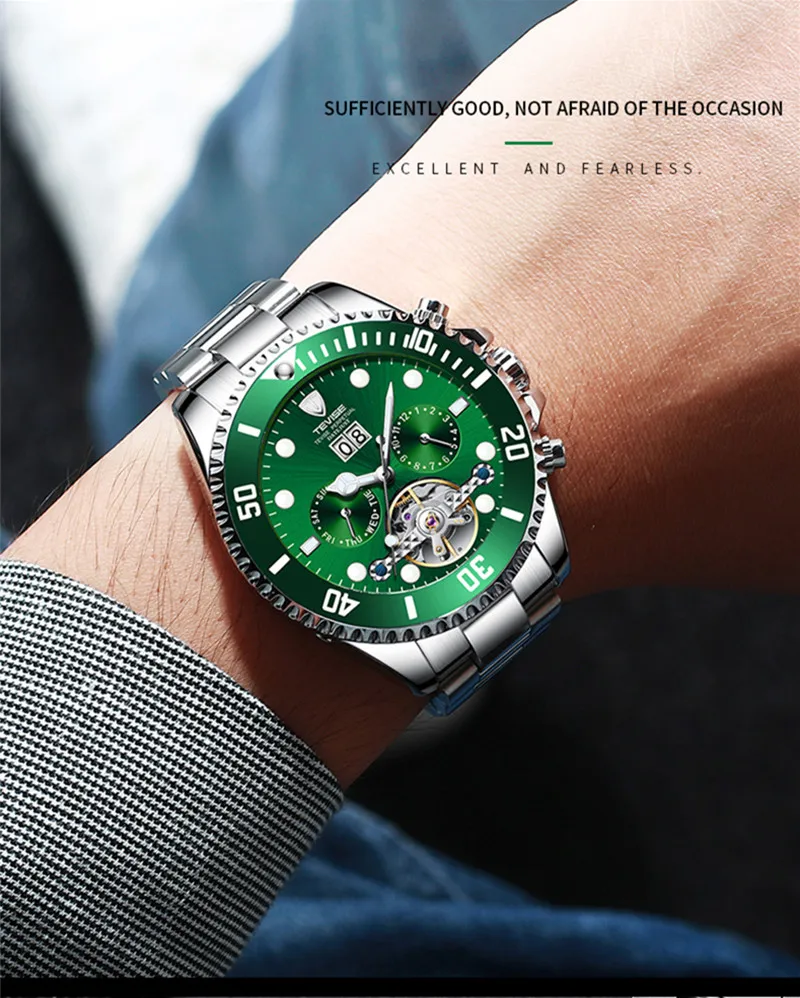 TEVISE зеленая вода призрак механические часы Для Мужчин's Водонепроницаемый часы с турбийоном Бизнес часы