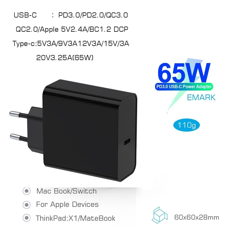 Зарядное устройство USB Type-C для ноутбуков, 65 Вт, 20 в, 3,25 А