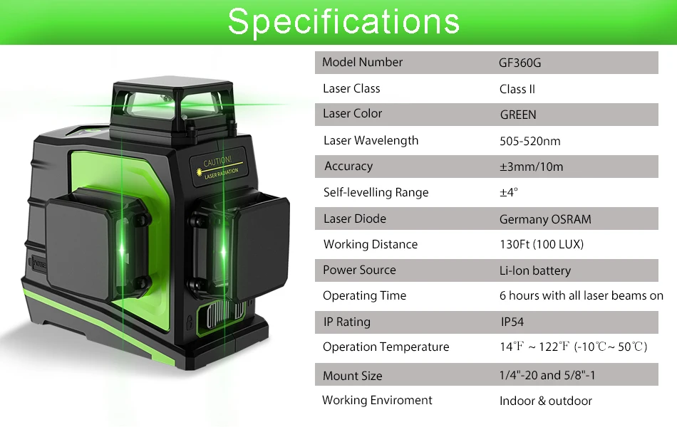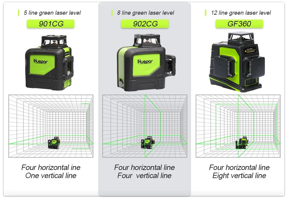 ➤ Каждый раз, когда кнопка питания нажимается один раз, лазерный инструмент проектирует 360 ° горизонтальных линий, 360 ° вертикальных линий и 360 ° вертикальных линий в последовательности.➤ 360 ° крышка горизонтальная линия и 360 ° вертикальная линия и 360 ° вертикальная линия (H360 °/V360 °/V360 °)
