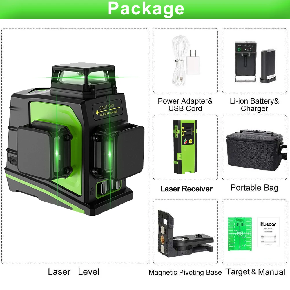 Huepar 3D перекрестный лазерный уровень 360 самонивелирующийся 12 линий зеленый луч измерительные инструменты включает в себя LR-6RG цифровой ЖК-лазерный приемник