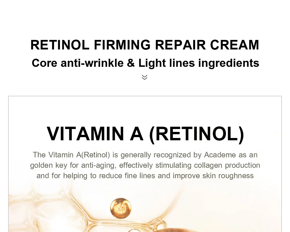 Ретинол подтягивающий восстанавливающий кремОсновные ингредиенты против морщин и светлых линийВитамин А (ретинол)Витамин А (ретинол), как правило, признан в качествеЗолотой ключ для омолаживания, эффективно стимулируя производство коллагенаИ для уменьшения морщин и улучшения шероховатости кожиОмолаживающий, повышающий эластичность, способствует производству коллагена и стимулирует клетки кожиВитамин С (аскорбиновая кислота) антиоксидант, предотвращающий старение кожи, подавляет образование меланина, укрепляет и отбеливает, маскезина нежная и прозрачнаяВитамин Е (токоферол) антиоксидант, предотвращающий старение тескина, подавляет образование меланина, укрепляет и отбеливает, делает кожу нежной и чистой