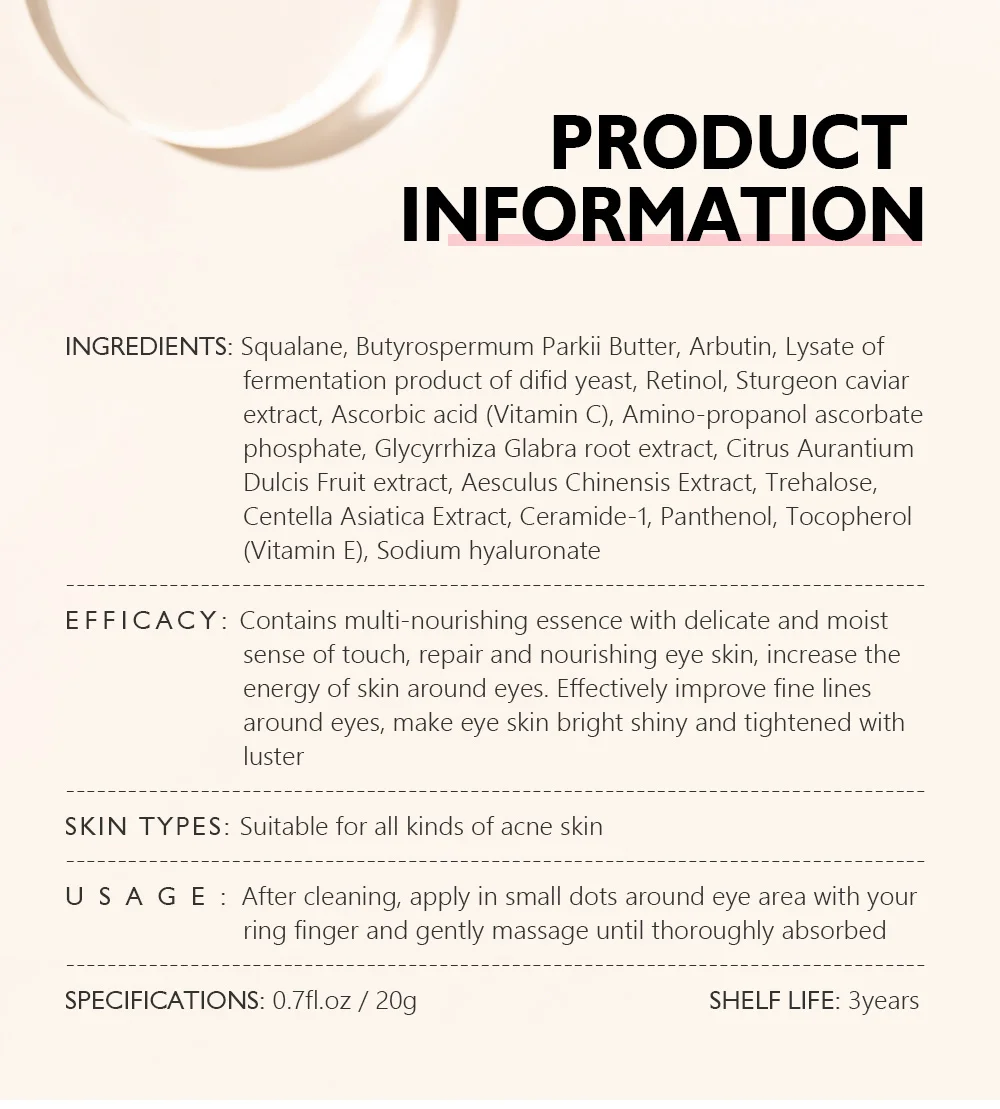 Информация о продуктеСостав: сквалан, бутироспермама парки масло, арбутин, лизат ферментации продукт дрожжей дифида, ретинол, осетровой икры экстракт, аскорбиновая кислота (витамин С), амино-пропанол аскорбатный фосфат, glycyrrhiza экстракт корня глабры, экстракт плодов цитрусовых Aurantium Dulcis, экстракт Aesculus Chinensis, трегалоза, экстракт центеллы азиатской, Ceramide-1, пантенол, Токоферол (витамин е), гиалуронат натрияЭффективность: содержит мульти-питательную эссенцию с нежным и влажным? Чувство прикосновения, восстанавливает и питает кожу вокруг глаз, увеличивает энергию кожи вокруг глаз. Эффективно улучшает тонкие линии вокруг глаз, делает кожу вокруг глаз яркой и подтянутой с блескомТип кожи: подходит для всех видов акнеПрименение: после очистки нанесите в мелкие точки вокруг области вокруг глаз безынерстным пальцем и Аккуратно помассируйте до полного впитыванияХарактеристики: 0.7fl.oz / 20gСрок годности: 3 года