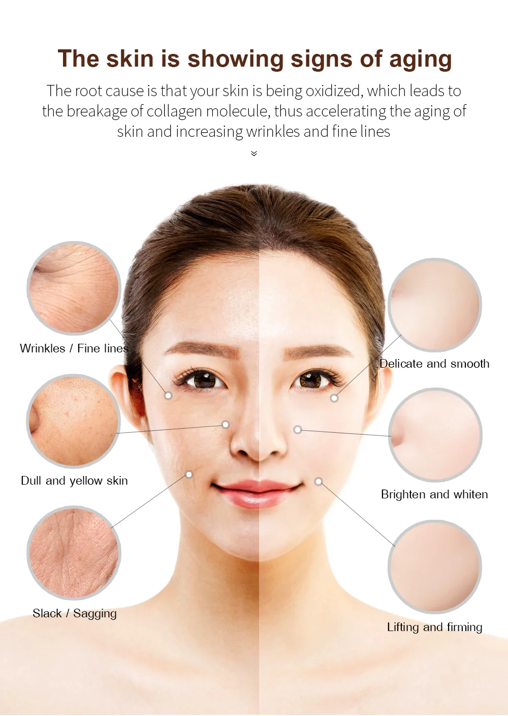 Кожа показывает следы старенияКоренной причиной является то, что ваша кожа окисляется, что приводит кПоломка молекулы коллагена, тем самым ускоряющая старениеКожа и увеличение морщин и морщин