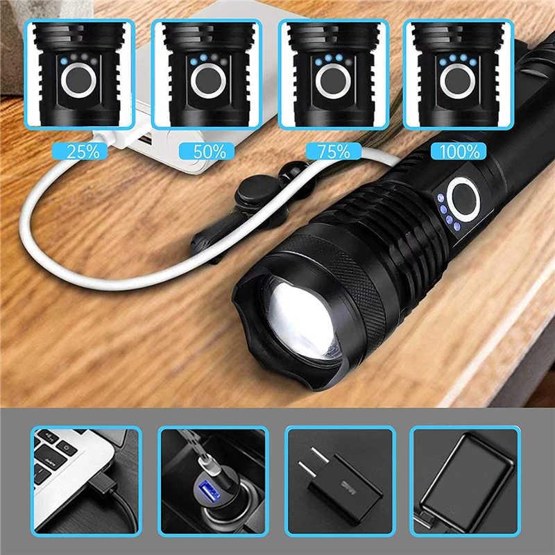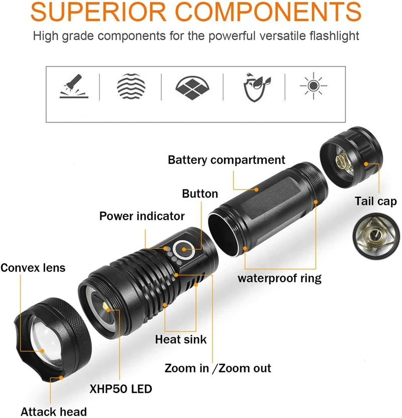 Светодиодный чип последнего поколения XHP50 может выпускать сверхвысокую мощность до 5000 люмен светильник куда угодно. С усовершенствованной выпуклой линзой высокой яркости, одна из самых ярких тактических светодиодных вспышек USB на рынке, Яркость при использовании лампочек более 100000 часов работы позволяет получить яркий и долгий свет, когда вам нужно.