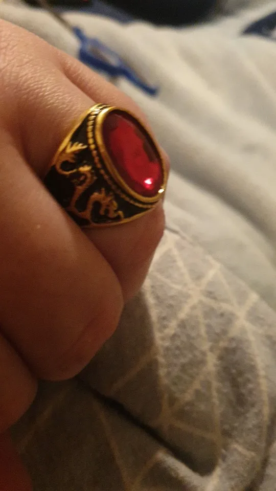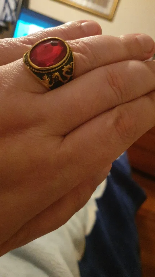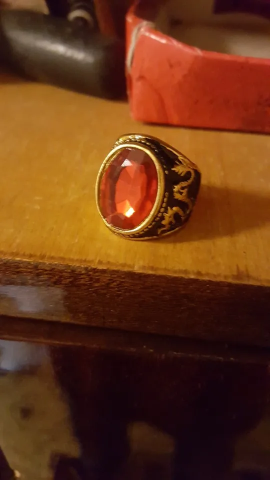 для повседневного ношения, конечно, вряд ли оно годится. слишком грубоватая работа. но для сценического аксессуара самое то. камень. точнее, то, что его заменяет, это, скорее всего, пластмасса. грубо обработанная и мутноватая. основа перстни. металл. с чернением. по размеру мне подошло. и со своей задачей этот предмет справился.