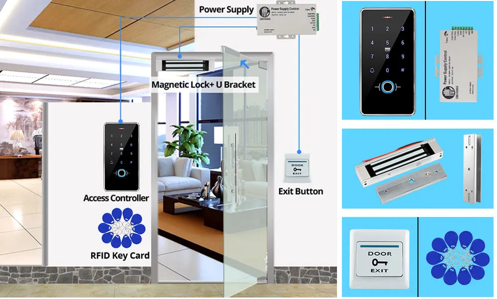 Подходит для бескаркасных стеклянных дверей. Нужен кронштейн U.Если ваша дверь бескаркасная стеклянная дверь, тогда понадобится u-образный кронштейнРазмер кронштейна U: 130*33*26 мм (Д/Ш/В)1 * контроллер доступа1*180 кг Стандартный магнитный замок1 * U кронштейн1 * источник питания1 * Кнопка выхода двери10 * RFID брелоки1 * Руководство пользователя