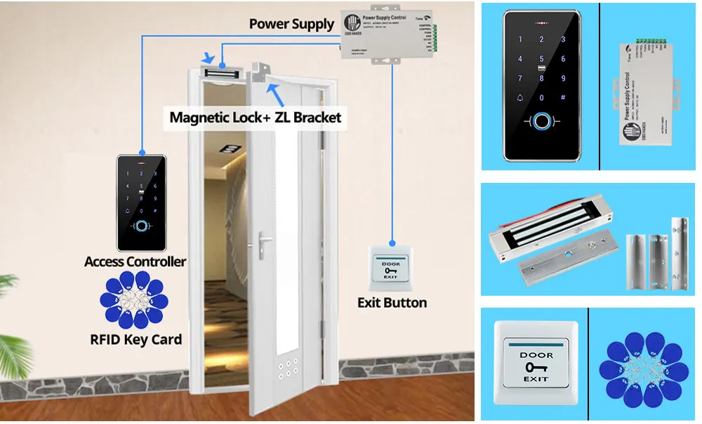 Подходит для деревянной, металлической двери. Нужен кронштейн L.Посмотрите на дверь внутри помещения, если дверь плоская или дверь в дверную раму меньше 3 см, вам нужно добавить L кронштейн.Размер кронштейна L: 170*34*25 мм (Д/Ш/В)1 * контроллер доступа1*180 кг Стандартный магнитный замок1 * L кронштейн1 * источник питания1 * Кнопка выхода двери10 * RFID брелоки1 * Руководство пользователя