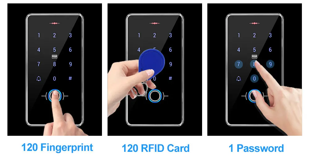 2, поддерживает три разных режима открытой двери.Поддержка отпечатков пальцев, RFID карты, пароль для открытия двери. Поддержка 120 отпечатков пальцев, 120 карт, 1 открытый пароль, более безопасный!