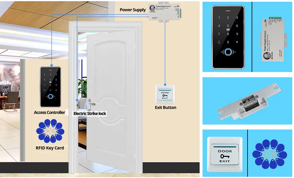 Если у вас уже есть собственный Электрический замок, вы можете выбрать этот комплект.1 * контроллер доступа1 * источник питания1 * Кнопка выхода двери10 * RFID брелоки1 * Руководство пользователя