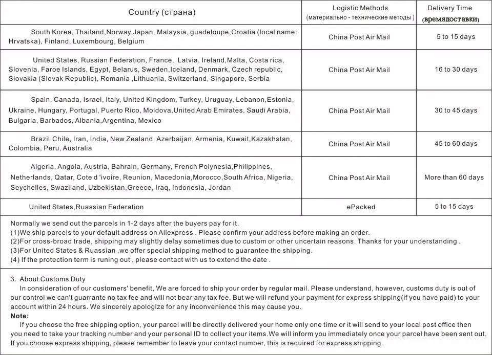 Доступна Онлайн оплата кредитной картой. Мы принимаем оплату T/T и Western Union. После подтверждения оплаты мы доставим товар в течение 3 рабочих дней. Если есть какие-либо импортные пошлины или налоги, покупатель несет ответственность