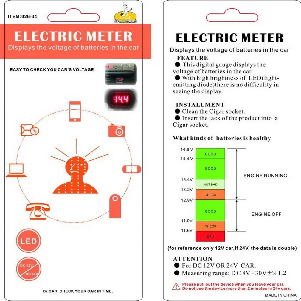 Особенности:Светодиодный Измеритель Напряжения прикуривателя для автомобильного аккумулятора.Дисплей напряжения автомобильного аккумулятора.Питание от автомобильного прикуривателя (DC 12 ~ 24 V).Установка: вставьте разъем продукта в гнездо для сигар.Этот цифровой датчик отображает напряжение батарей в автомобиле.С высокой яркостью светодиодный (светильник-излучающий диод) не трудно видеть дисплей.Установка: Очистите гнездо для сигар. Вставьте разъем продукта в гнездо для сигар.Описание:Тип дисплея: ЦифровойРабочая температура: от-10 до + 80 градусов ЦельсияКласс точности: высокийТип изделия: тестеры батарейНапряжение: DC12-24VВо время работы двигателя (без привода) светодиодный дисплей:Между 13,5 до 14,5 (12V автомобиль)Между 26,0 ДО 28,0 (24V автомобиль)С выключенным двигателем, и ничего не включено, светодиодный дисплей:Больше, чем 12,0 (12V автомобиль) или 24,0 (24V автомобиль) (информация дана только в справочных целях)Диапазон измерений: постоянный ток, 8 в-30V ± % 1,2Характеристики:Цвет: черныйМатериал: пластикРазмер: 70*40*30 ммСодержание упаковки:1 х Электрический измеритель напряженияПримечание:Пожалуйста, вытащите устройство, когда вы покидаете свой автомобиль, не используйте устройство более 2 минут в автомобилях 24 В, или оно выгорит.