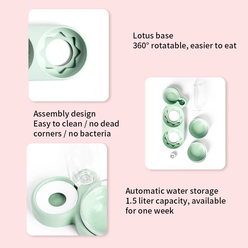 Поворот на 360 ° снизу, предлагая различные углы иметь 3 тяжелых кошки едят одновременно. Съемные детали, миски легко вынимаются для очистки или добавления пищи.