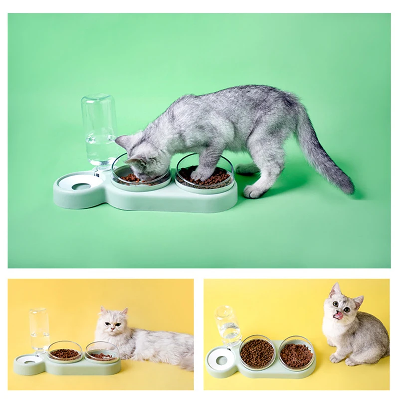 3 в 1 Автоматическая чаша для воды и чаша кормушка для пищи набор, две пластиковые миски для кошек и собак можно держать сухую еду для кошек и мокрое корм для кошек и собак отдельно, наклон 15 ° для защиты шеи кошки двойная миска для еды, двойная миска для еды, вращающаяся на 360 °, 3 полных кошки могут питаться без сжатия.