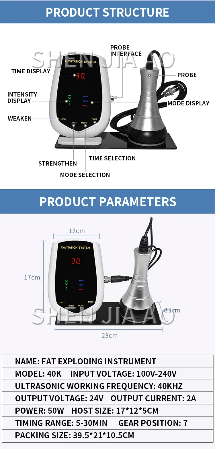 Название: инструмент для сжигания жира Модель: 40K Ультразвуковая Рабочая частота: 40 кГц Входное напряжение: 100-240 В Выходное напряжение: 24 В Выходной ток: 2A Мощность: 50 Вт Размер хоста: 17*12*5 см Диапазон времени: 5-30 мин Положение шестерни: 7 Размер упаковки: 39,5*21*10,5 см