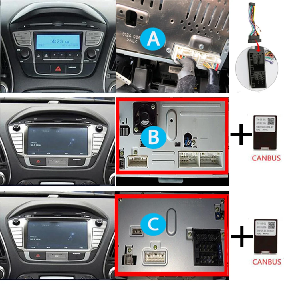 Hyundai ix35 Tucson 2 2009-2015 автомобили имеют 3 различных кабеля питания с различными интерфейсами, разделенные на A/B/C. Конфигурация автомобиля отличается, интерфейс питания отличается, пожалуйста, купите соответствующую посылка в зависимости от машины конфигурации, если вы покупаете не ту посылка, радио не может быть установлено, если вы не можете подтвердить, пожалуйста, свяжитесь с онлайн-сервисом. 1. Передняя часть автомобильной центральной консоли такая же, как на картинке A. Вы можете напрямую купить радиомодель по ссылке, а шнур питания полностью подходит для вашего автомобиля. (покупайте напрямую по ссылке, отправьте кабель по умолчанию)2. Интерфейс на передней части автомобильной центральной консоли/задней части радио такой же, как на рис. B или C. Вы можете связаться со мной и приобрести высококачественный шнур питания + canbus, чтобы соответствовать вашей модели автомобиля. (нажмите «купить сейчас кабель B или C», чтобы купить кабель питания B или C с canbus)