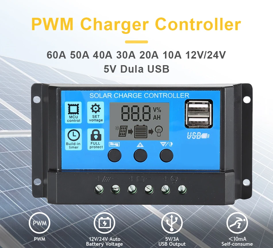 Контроллер заряда солнечной батареи, ШИМ 12В 24В 60A50A30A10A, автоматические контроллеры, ЖК-дисплей, двойной USB, большой ЖК-дисплей, Встроенный микроконтроллер