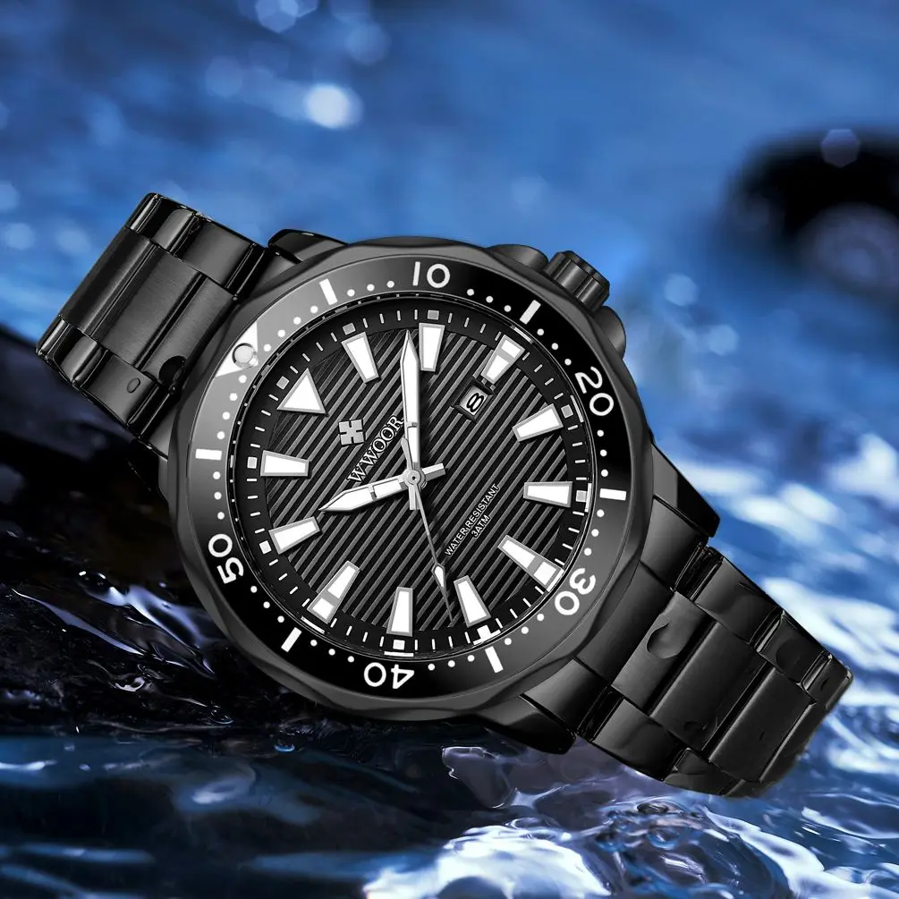 Новинка 2021, роскошные полностью черные стальные часы WWOOR, Мужские Спортивные Светящиеся Кварцевые водонепроницаемые военные наручные часы для дайвинга, мужские часы