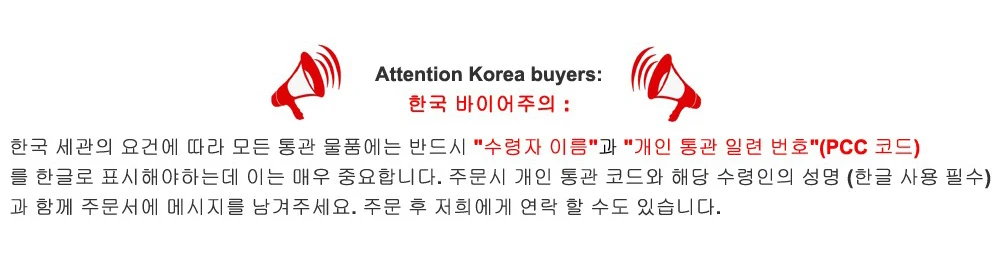 한국 세관 요건으로 인해 모든 한국 구매자는 개인 세관 코드와 русский 이름을 제공해야합니다. 입력하신 개인 인증 코드가 정확하지 않을 경우 배송이 불가능할 수 있습니다! 따라서 주문시 비고란에 개인 세관 코드를 입력하십시오. 대단히 감사합니다!
