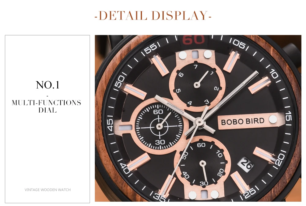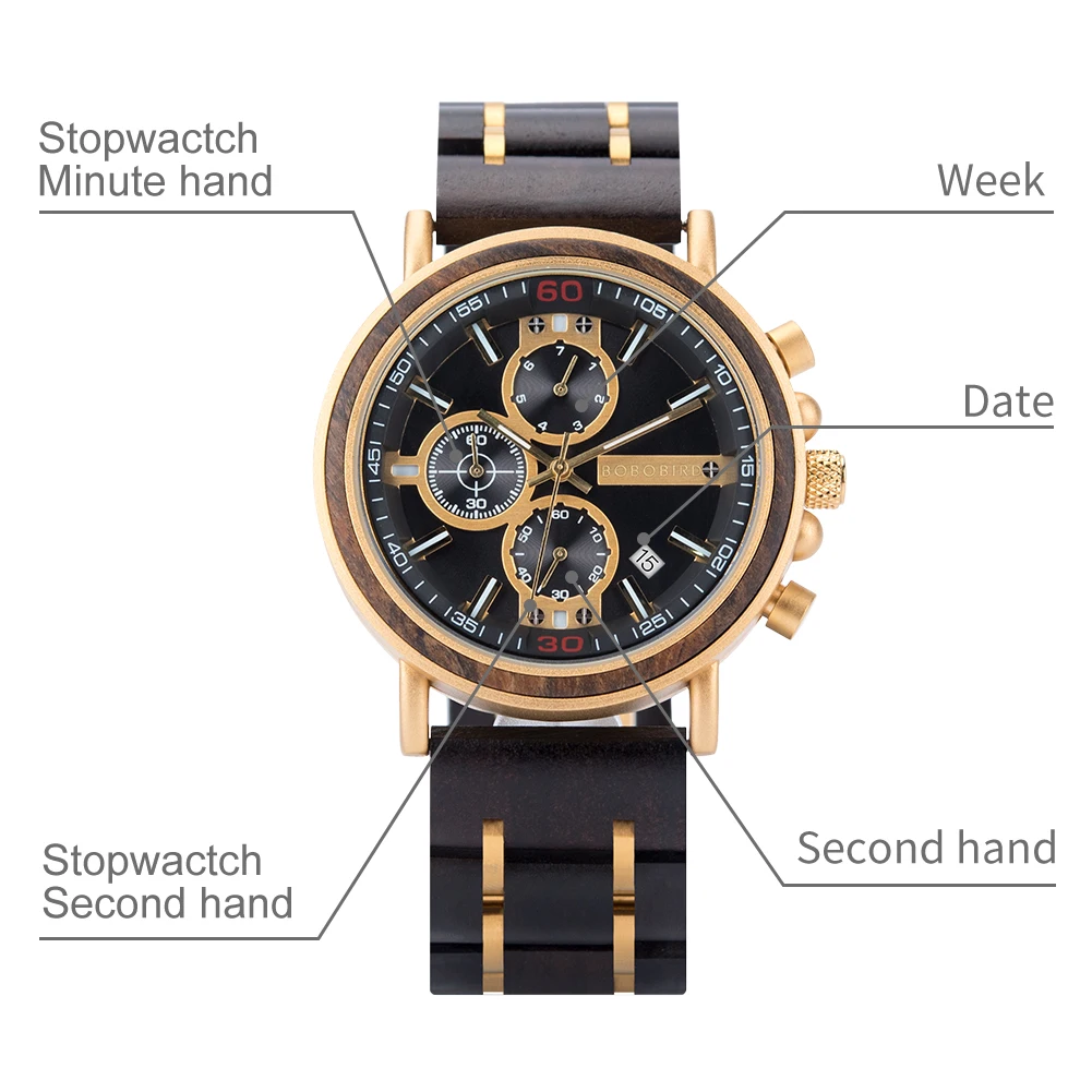 Мужские часы BOBO BIRD, кварцевые часы, деревянные, хронограф, показывают дату, светящиеся иглы, в подарочной коробке