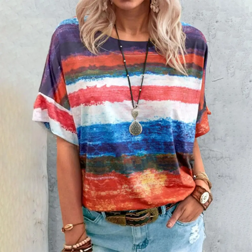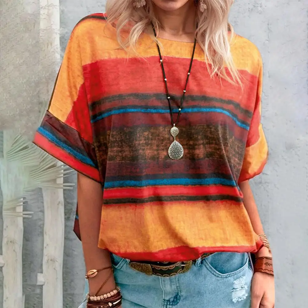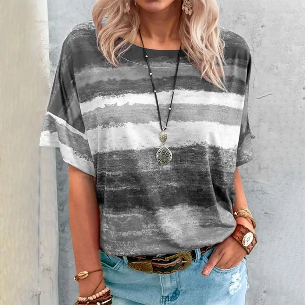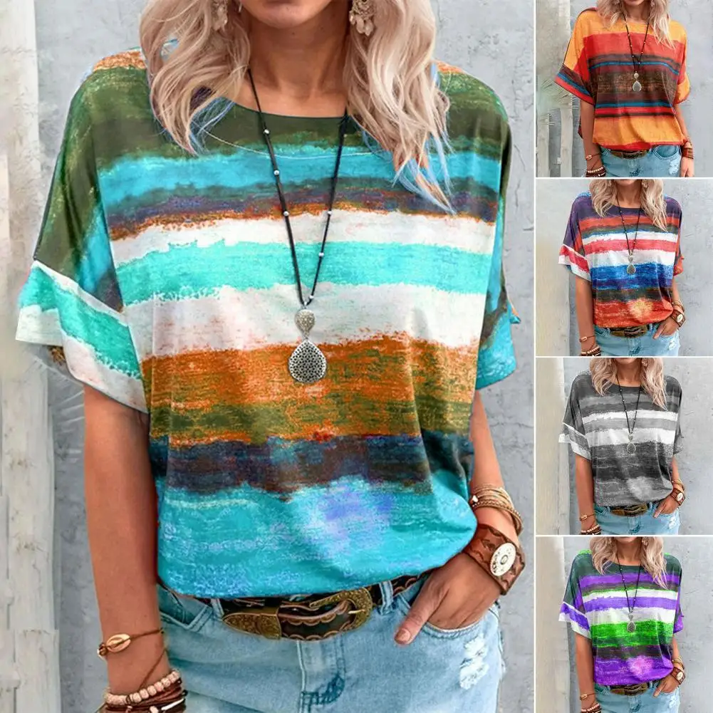 Женская футболка размера плюс, повседневные FemaleContrast Цвет с полосатым принтом, Женские топы с коротким рукавом и круглым вырезом для повседневной носки свободные футболки для девочек