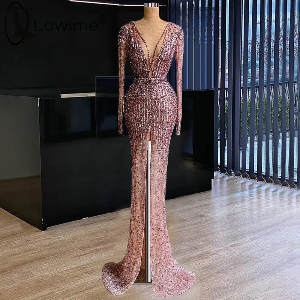 Вечерние платья с блестками и бусинами Русалка 2021 мусульманское сексуальное платье с длинным рукавом с глубоким V-образным вырезом Вечерние платья с передним разрезом платья