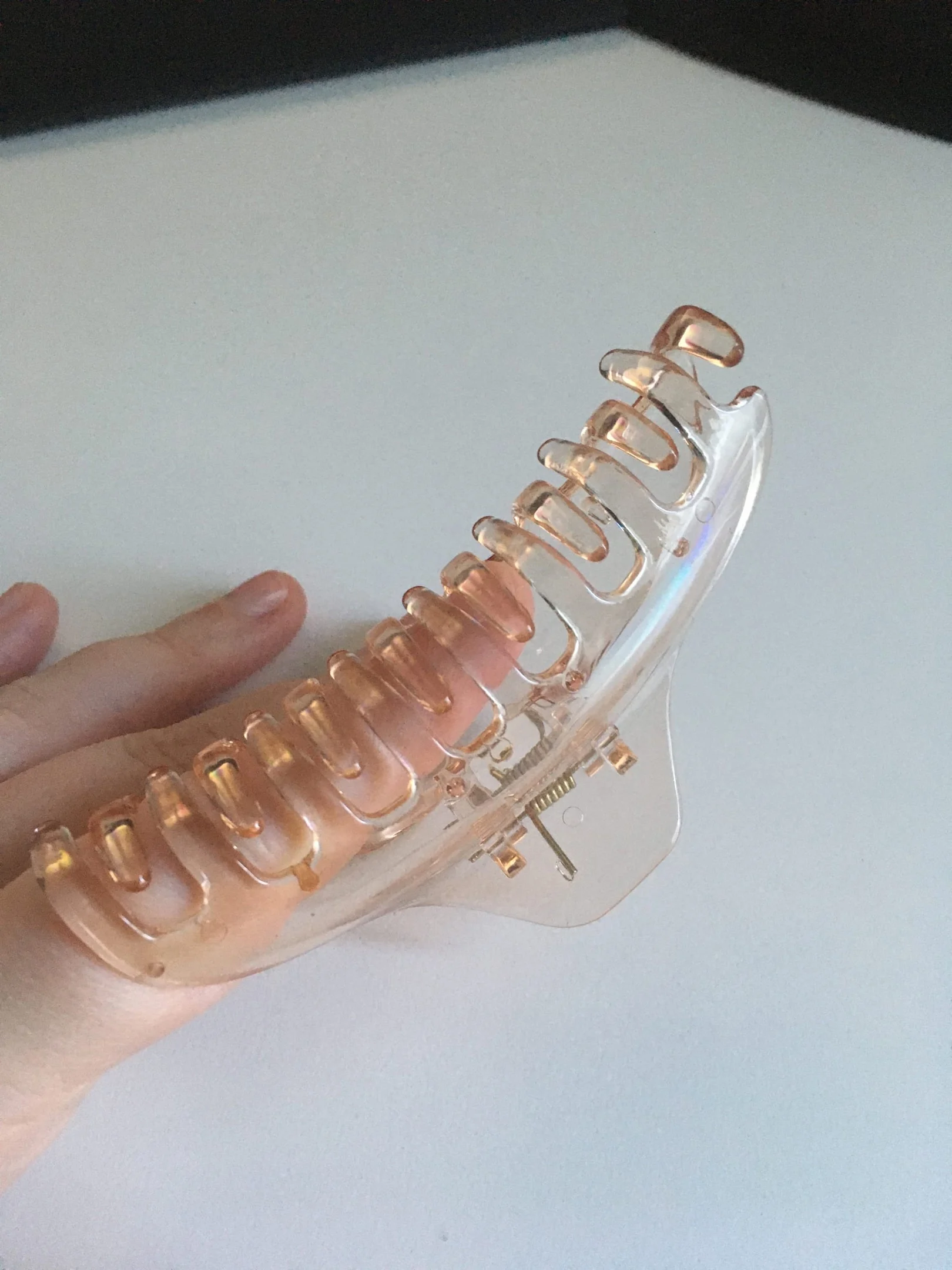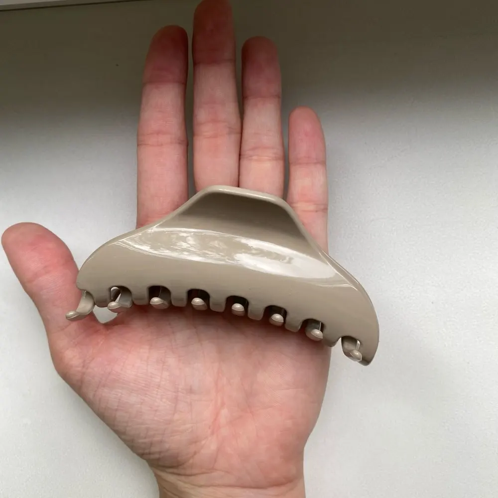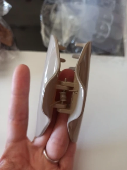 Пружина жесткая, держит хорошо, на фоне руки хорошо видно размер, удобная форма, красивая. Несмотря на жесткую пружину не перелавливает и голова не болит. У меня волосы короткие, держит , ничего не выпадает, возможно тем, у кого волосы ниже плеча будет маловато.