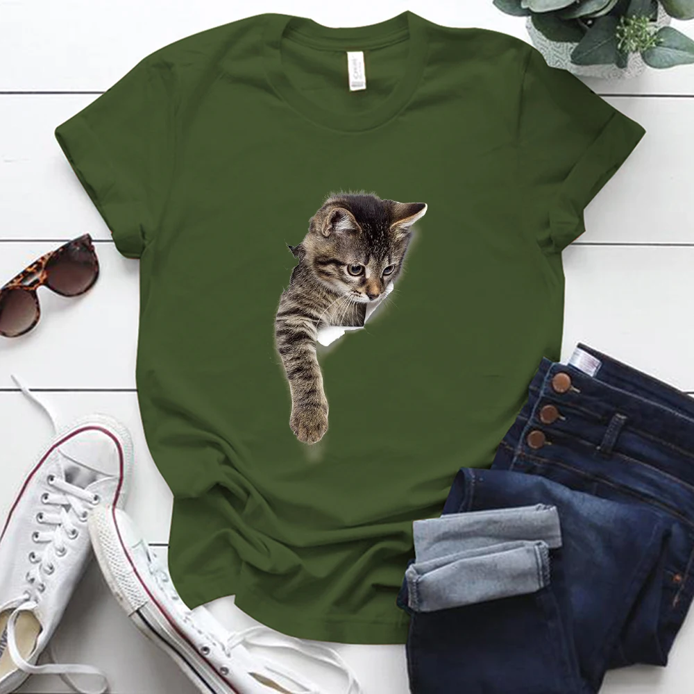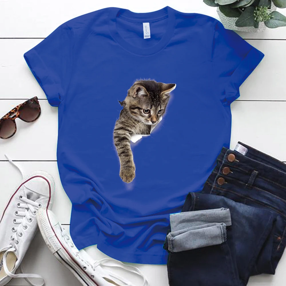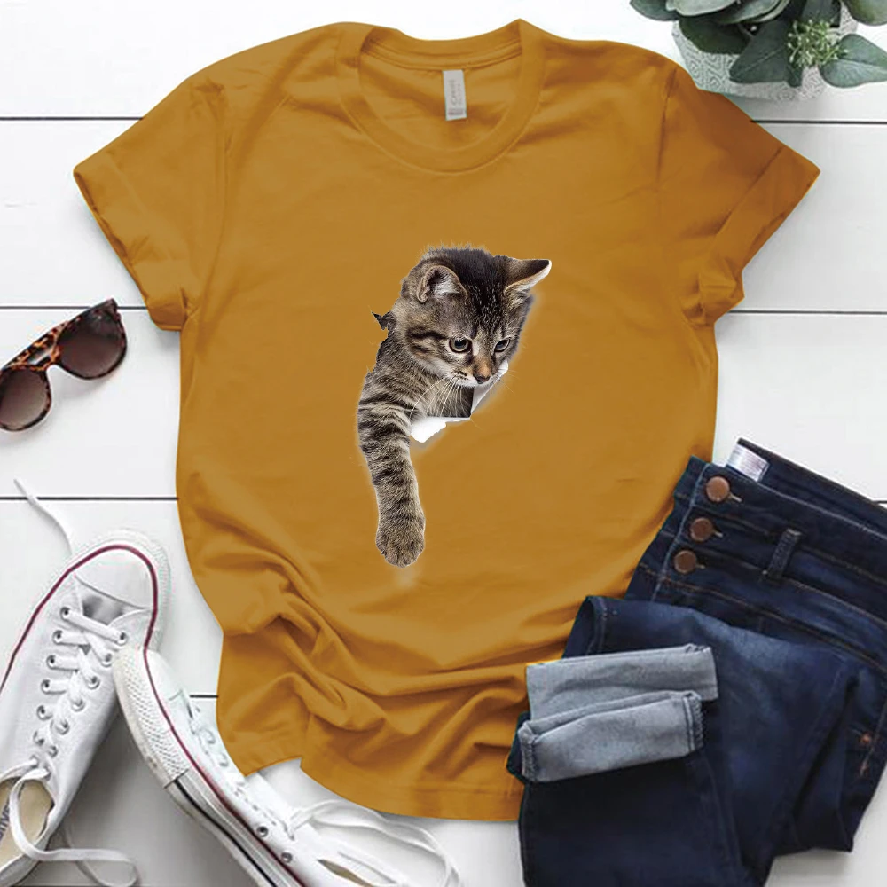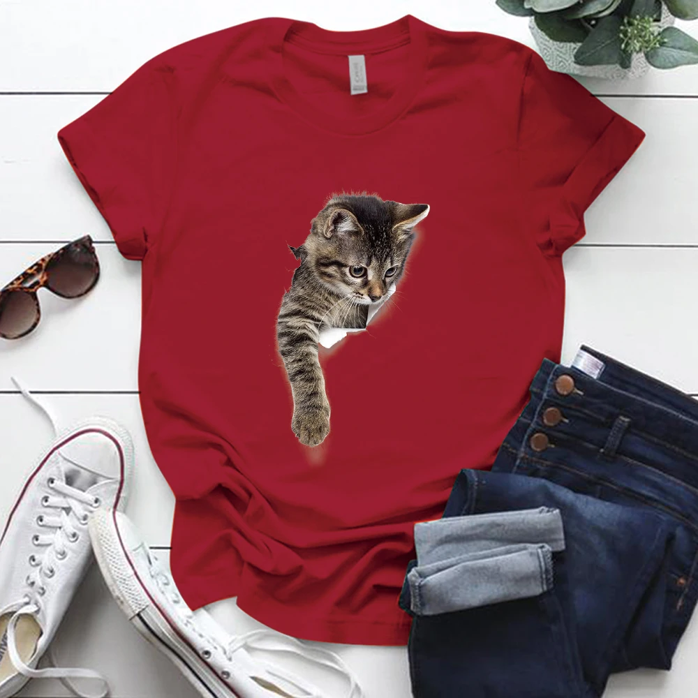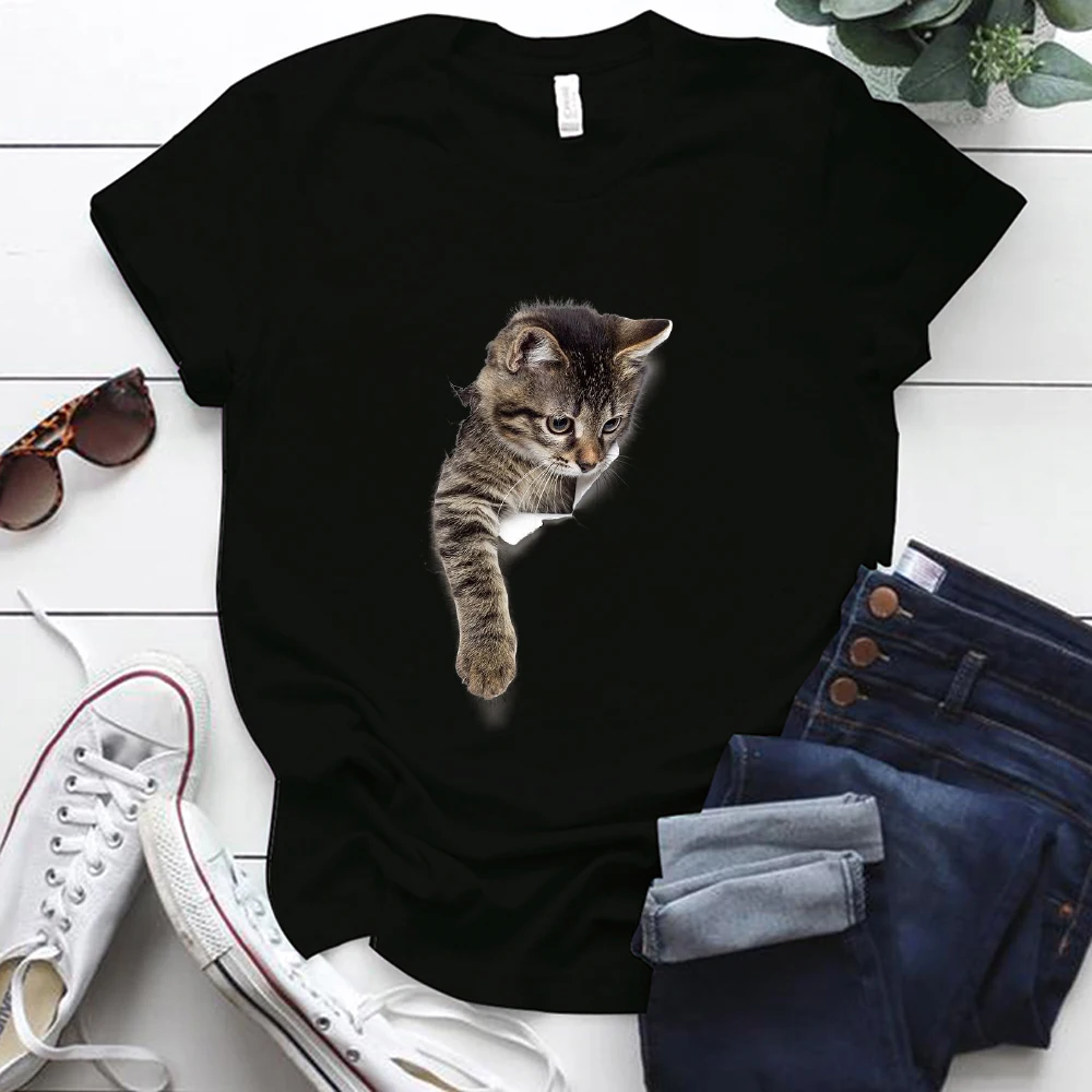 Футболка женская с круглым вырезом, Свободный Топ с принтом кота и ...
