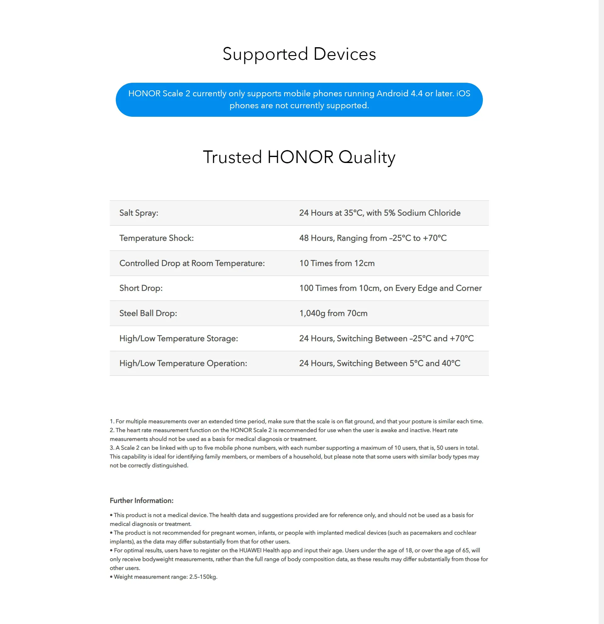 Батарейки в комплект не входят.Поддерживает только Android 4,4 или более позднюю версию.Не поддерживает iOS.HONOR Scale 2 может не распознать пользователей, данные тела которых очень похожи на данные другого устройства.Немедицинское оборудование. Все данные приведены только для справки, но не для диагностики или медицинского использования.Не подходит для беременных, младенцев и людей, имплантированных медицинским устройством.Для людей младше 18 лет и старше 65 лет изделие может обеспечить только точное измерение веса.