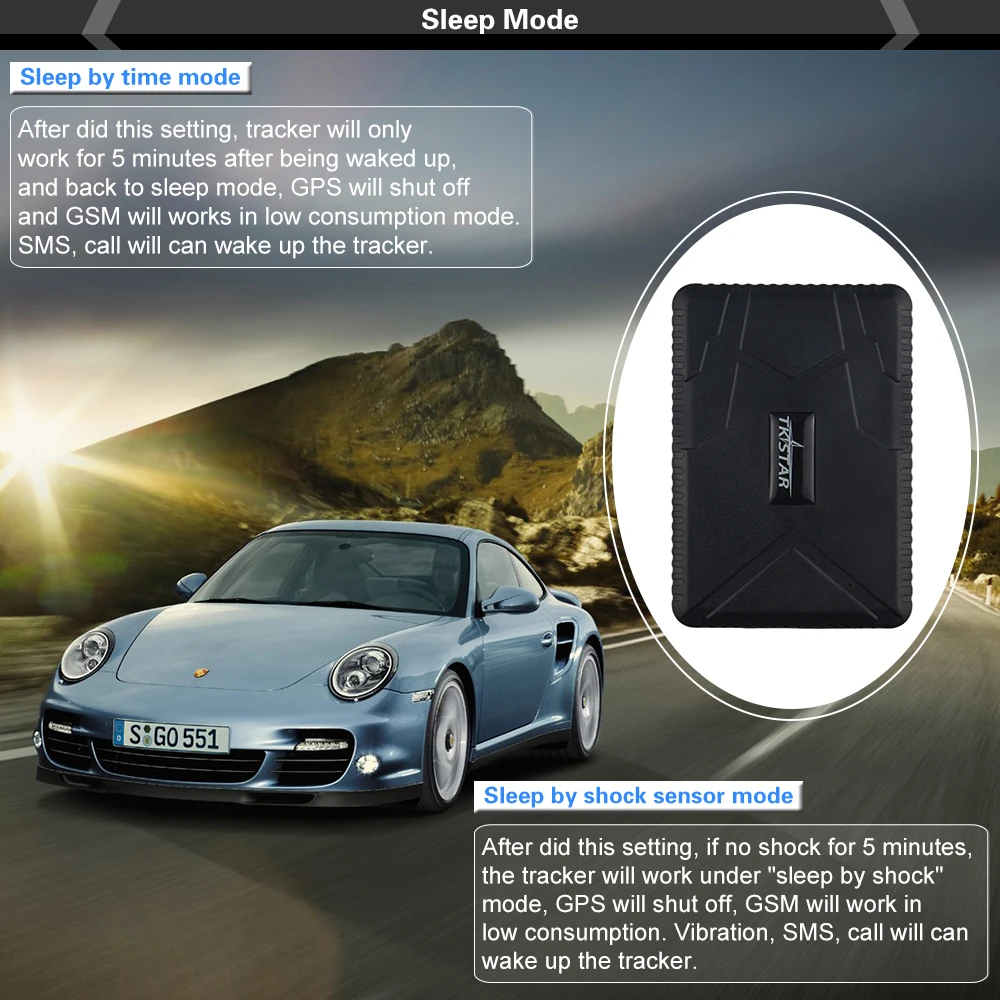 * Режим сна с помощью датчика удара: после этого настройки, если нет шока в течение 5 минут, трекер будет работать под режимом «Сон шоком», GPS отключится, GSM будет работать при низком потреблении. Вибрация, SMS, звонок может разбудить трекер.