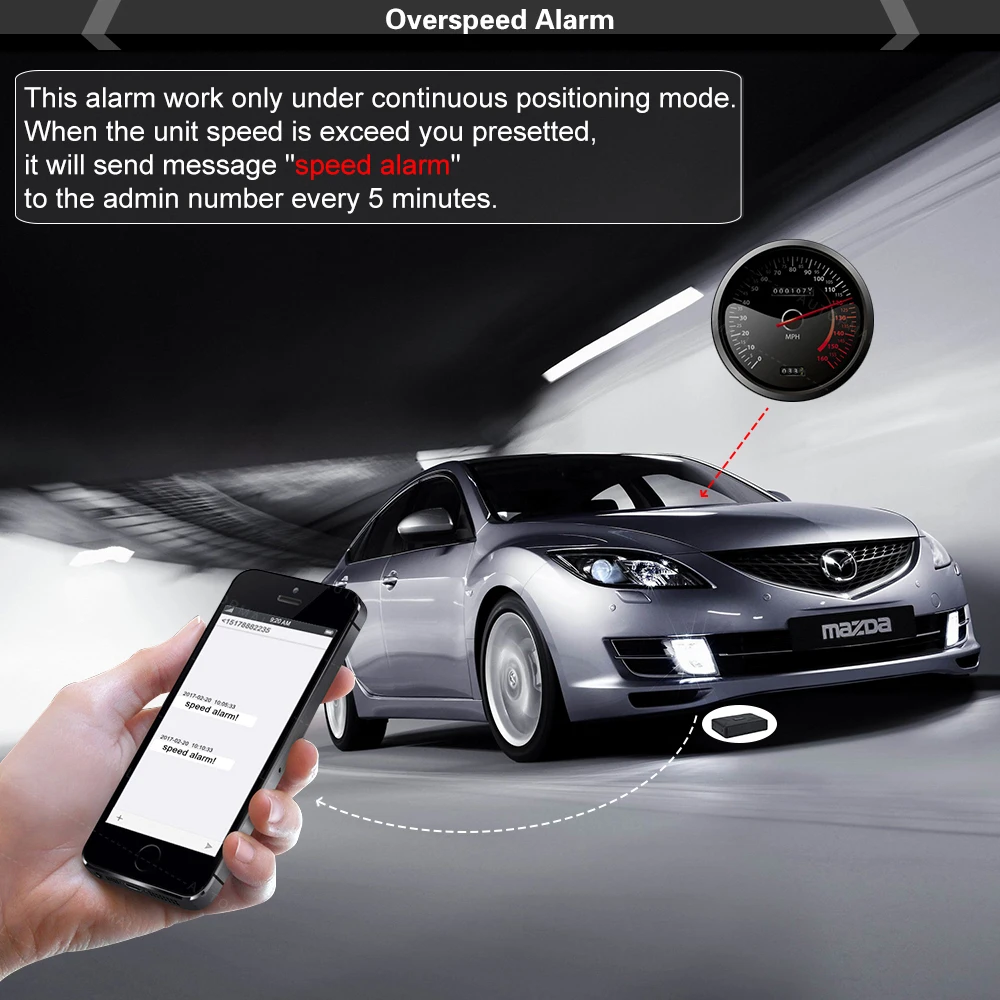 4.Сверхскоростная сигнализация: Этот будильник работает только в режиме непрерывного позиционирования. Когда скорость устройства превышает скорость, которую вы указали, он отправит сообщение «сигнал скорости!» на номер admin каждые 5 минут.
