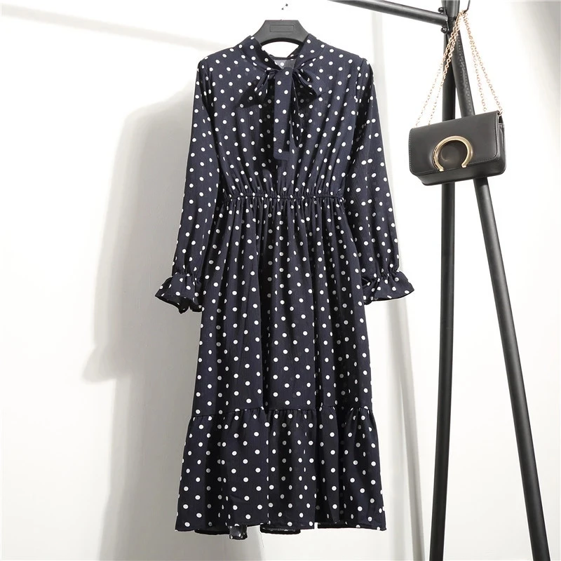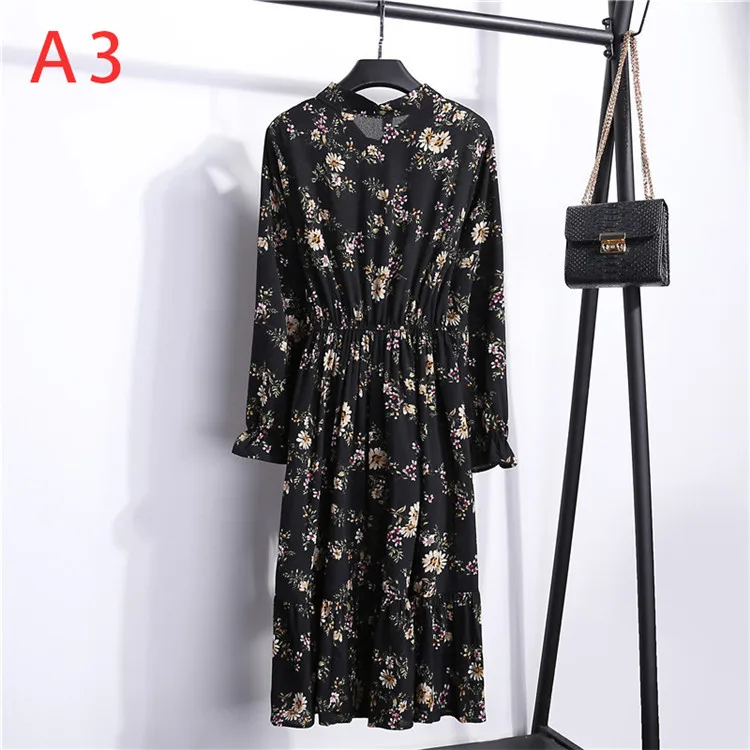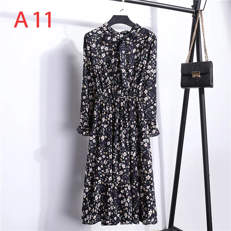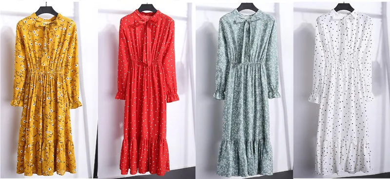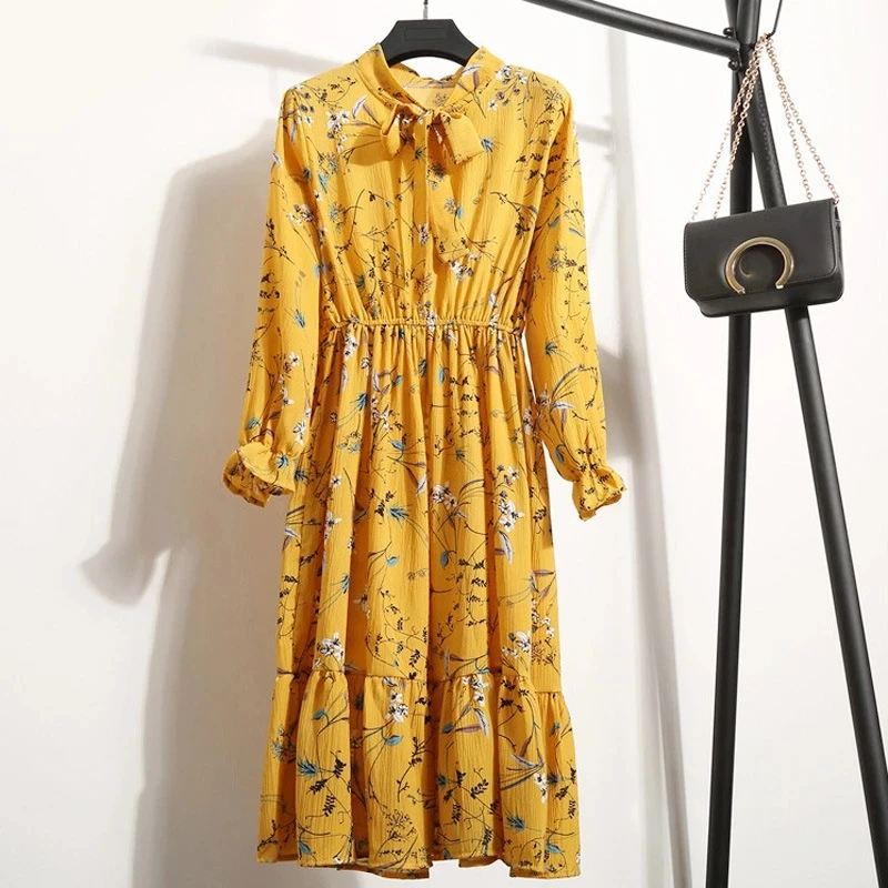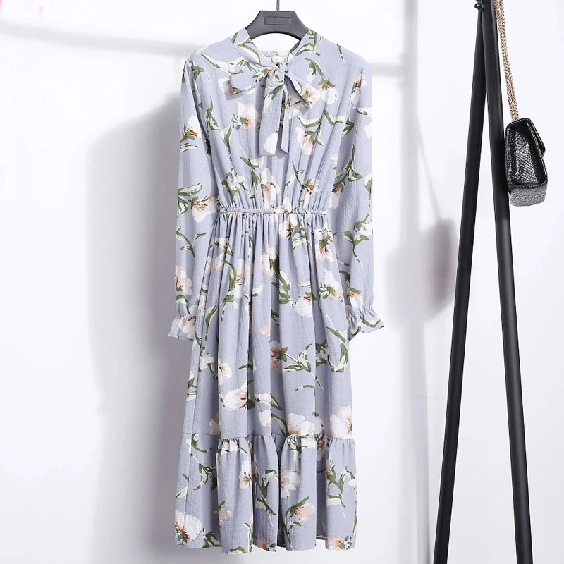 Весеннее шифоновое платье 2021, женское платье миди в стиле ретро с цветочным принтом и длинными рукавами и бантом, весенне-осеннее платье с рукавами-трубами