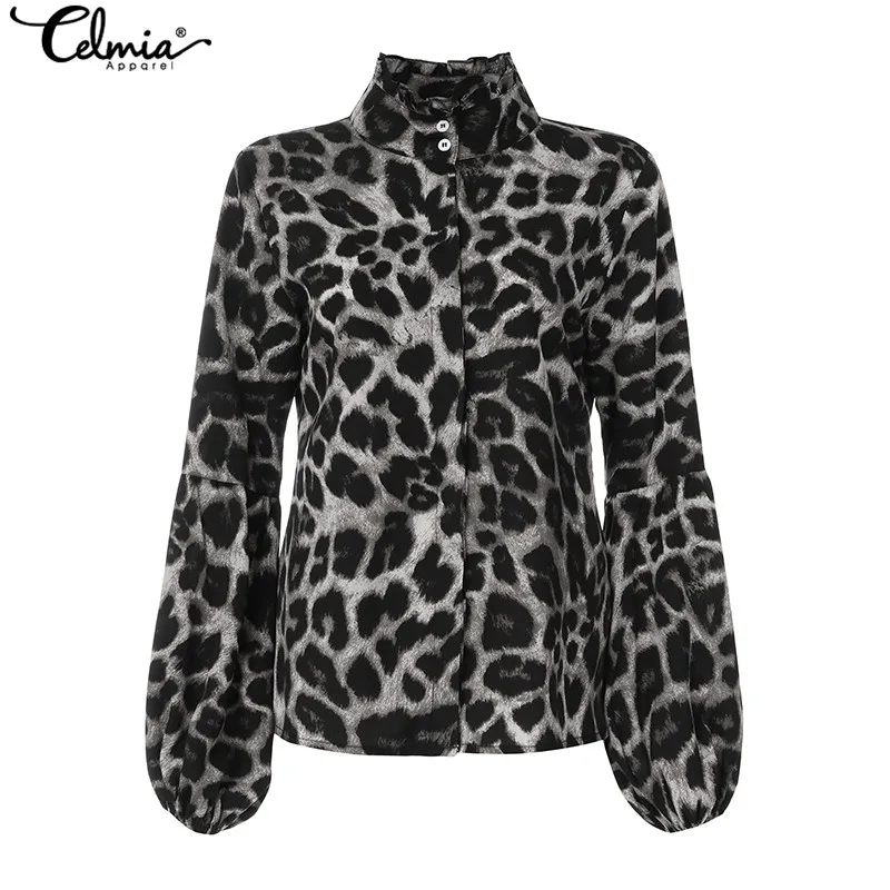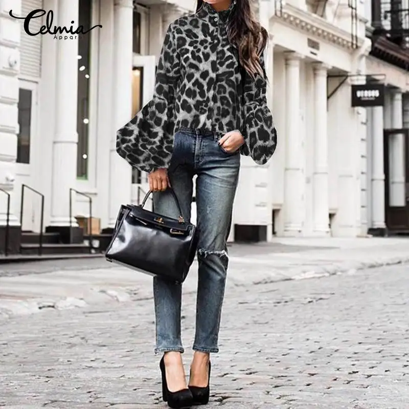 Элегантные офисные рубашки Celmia 2021, модные женские блузки, сексуальная туника с леопардовым принтом и рукавами-фонариками и высоким воротником