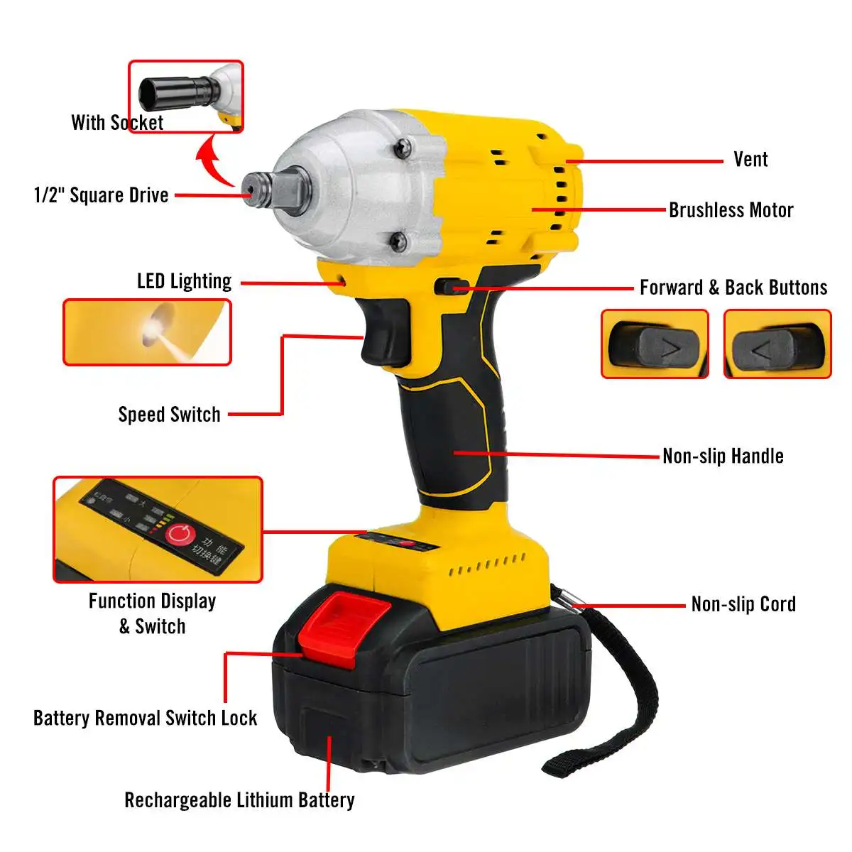 Особенности:-1/2 "Квадратный привод.-Легко сделать или отменить автомобильные колеса.-Высокий крутящий момент, плавный Переключатель изменения скорости.-Вал из вольфрамовой стали, высокая твердость и износостойкость.-Подходит для строительных площадок, технического обслуживания, деревообработки и т. Д.-Обратного вращения автоматическая остановка режим отключения удара и вращение в 0,2 секунд после того, как болт/гайка получает расшаталось достаточно.-Обеспечивает различные крепежные элементы управления для широкого спектра применений, таких как строительные леса, автомобильные шины, автомобили, установка и производство.